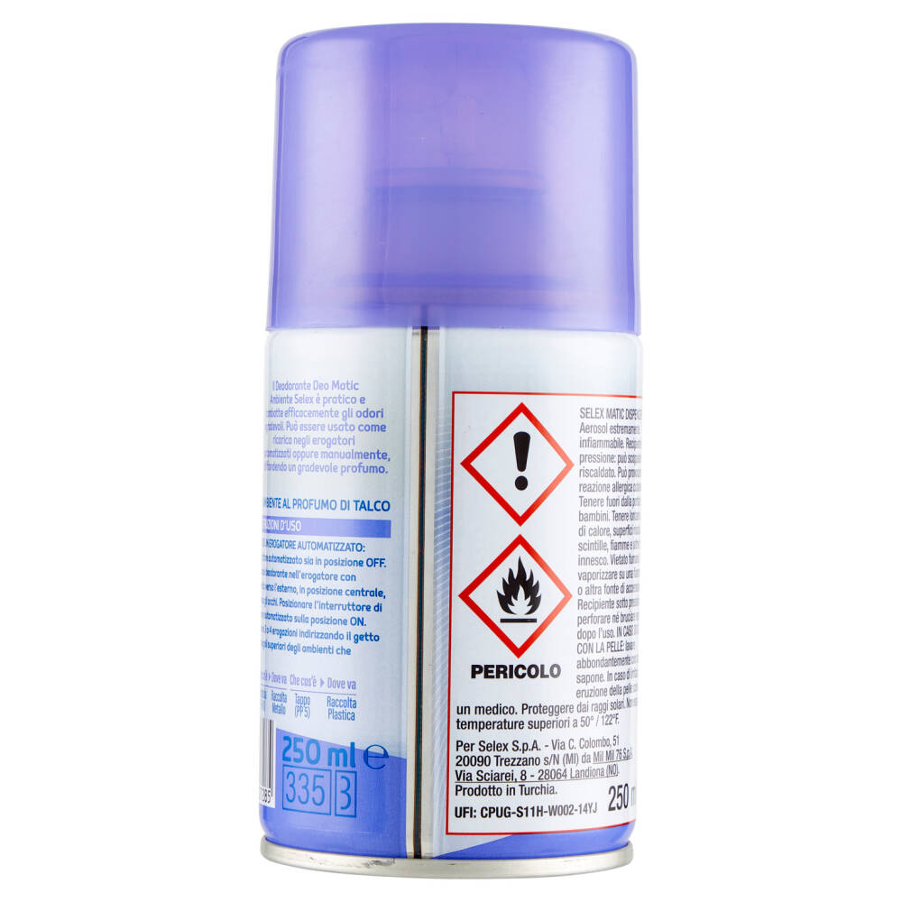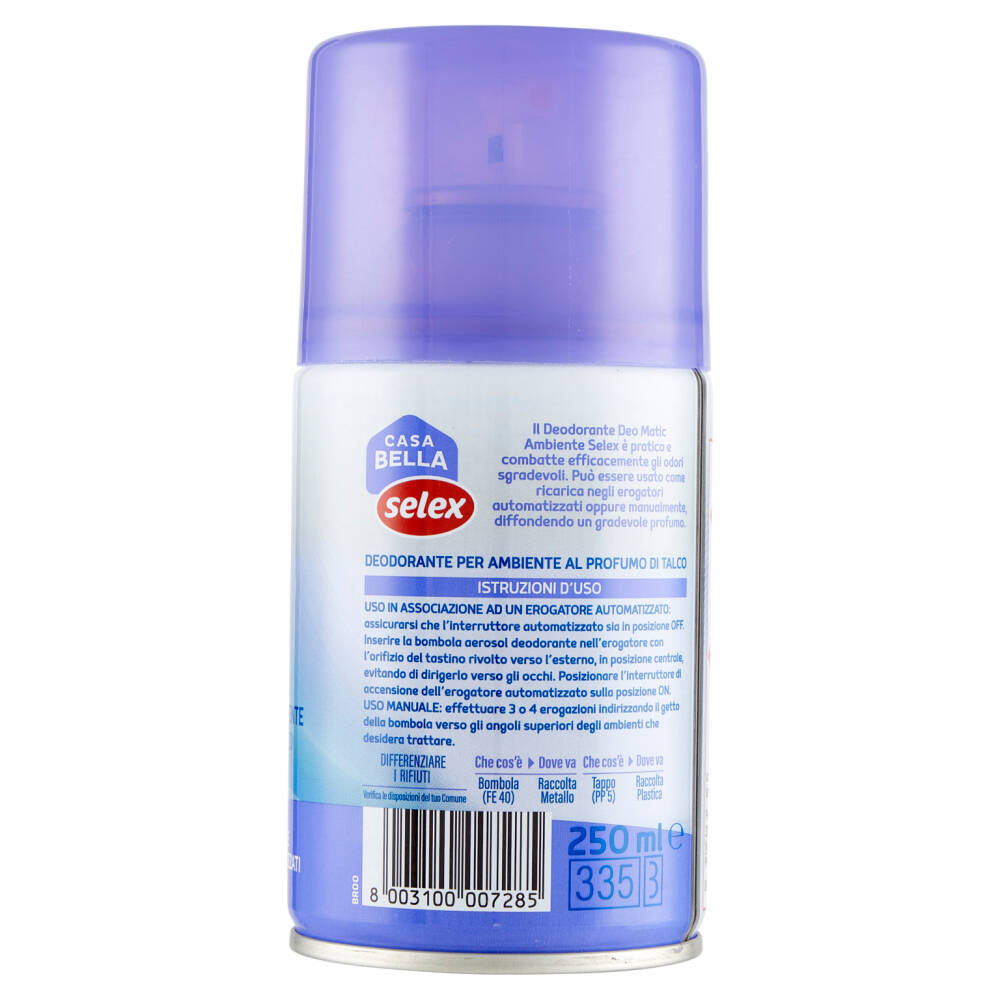 Il Deodorante Deo Matic Ambiente Selex è pratico e combatte efficacemente gli odori sgradevoli. Può essere usato come ricarica negli erogatori automatizzati oppure manualmente, diffondendo un gradevole profumo.