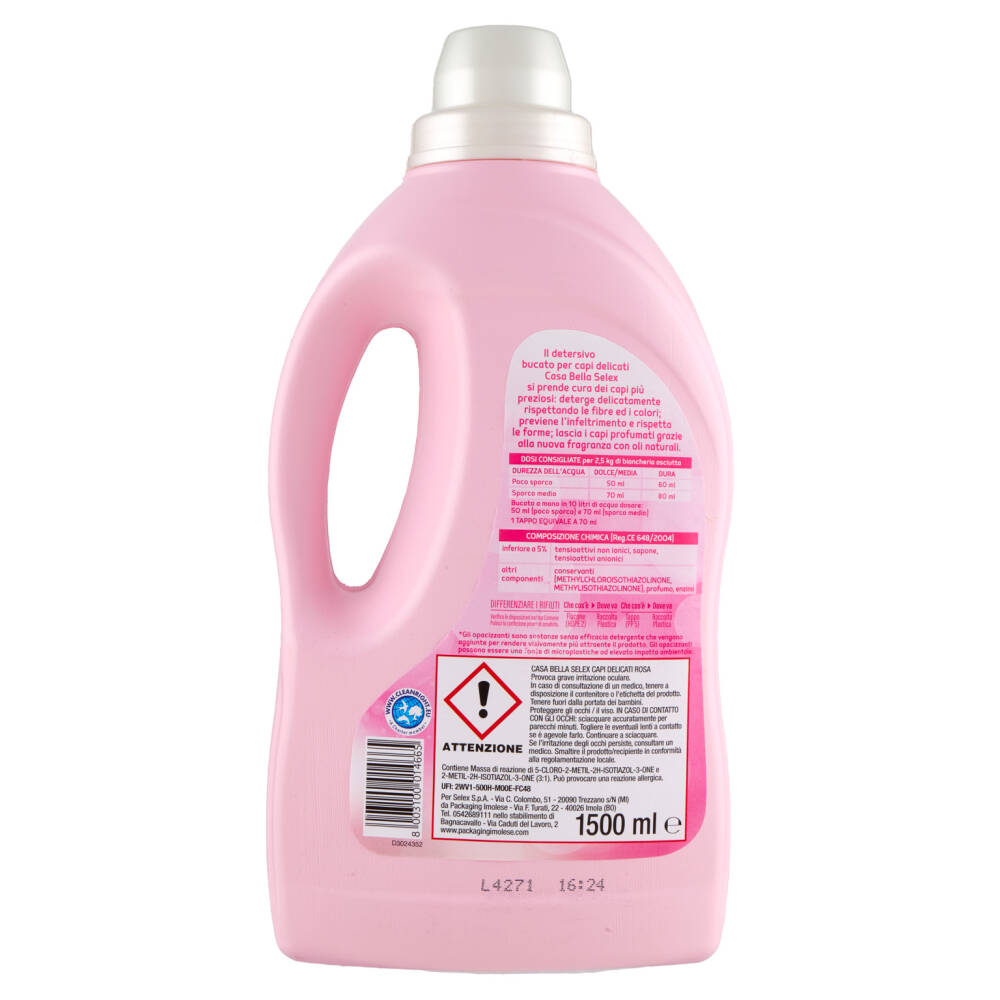 Il detersivo bucato per capi delicati Casa Bella Selex si prende cura dei capi più preziosi: deterge delicatamente rispettando le fibre ed i colori; previene l'infeltrimento e rispetta le forme; lascia i capi profumati grazie alla nuova fragranza con oli naturali.