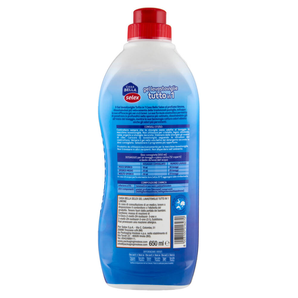Il Gel lavastoviglie Tutto in 1 Casa Bella Selex al profumo limone, dissolvendosi più velocemente delle tradizionali pastiglie, sviluppa la sua efficacia già nei cicli brevi. La sua formula enzimatica permette di penetrare in profondità nello sporco più ostinato, dissolvendolo già all'inizio del lavaggio, mentre la sua tecnologia cattura odori elimina anche gli odori più persistenti.