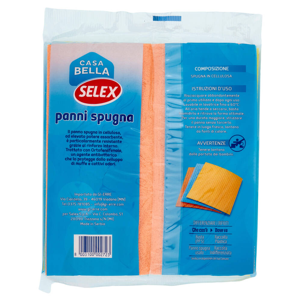 Il panno spugna in cellulosa, ad elevato potere assorbente, è particolarmente resistente grazie al rinforzo interno. Trattato con Ortofenilfenolo, un agente antibatterico che lo protegge dallo sviluppo di muffe e cattivi odori.