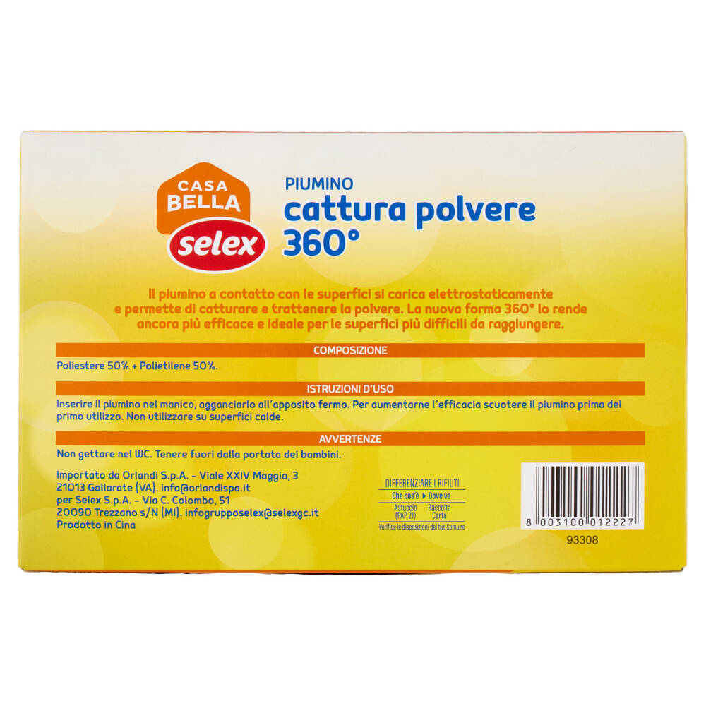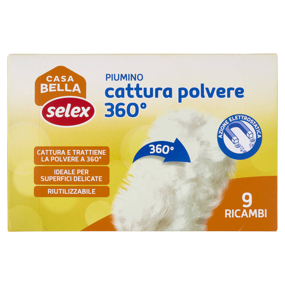 Il piumino a contatto con le superfici si carica elettrostaticamente e permette di catturare e trattenere la polvere. La nuova forma 360° lo rende ancora più efficace e ideale per le superfici più difficili da raggiungere.