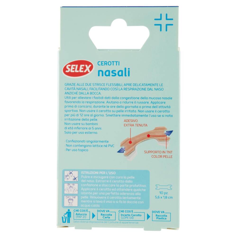 Utili per alleviare i fastidi dati dalla congestione della mucosa nasale favorendo la respirazione. Aiutano a ridurre il russare. Applicare prima di caricarsi, durante le ora della giornata o prima dell'attività sportiva. Non usare il cerotto su pelle irritata. Non usare il cerotto per più di 12 ore al giorno. Smettere immediatamente l'uso se si nota irritazione della pelle. Non usare su bambini di età inferiore ai 5 anni. Solo per uso esterno.