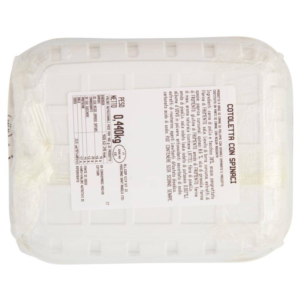 Carne di tacchino macinata 35% Acqua Pangrattato (farina di frumento, sale, lievito di birra, curcuma, estratti di spezie: paprica e curcuma) Spinaci 7,4% Olio di girasole Farina di frumento Farina di mais Semola di grano duro Carne di pollo macinata 2,9% Glutine di frumento Sale Amido di frumento Fibra di pisello Sale iodato Amido di pisello Albume d'uovo in polvere Aromi naturali Proteine vegetali idrolizzate di mais Agenti lievitanti: difosfato disodico, carbonato acido di sodio Aromi Spezie Aroma naturale di formaggio Cipolla Antiossidante: estratti di rosmarino, ascorbato di sodio Può contenere sedano, senape e soia