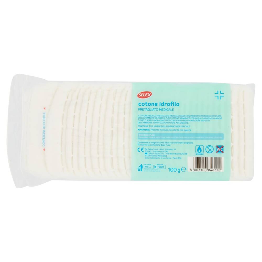 Il Cotone idrofilo pretagliato medicale Selex è un prodotto morbido costituito esclusivamente da fibre di puro cotone sbiancato con acqua ossigenata anziché cloro o altri candeggianti ottici artificiali per un maggiore rispetto dell'ambiente. Ha un elevato potere assorbente.