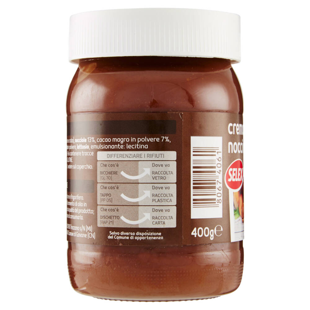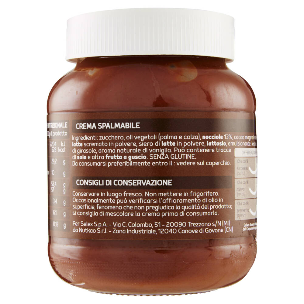 Zucchero Oli vegetali (palma e colza) Nocciole 13% Cacao magro in polvere 7% Latte scremato in polvere Siero di latte in polvere Lattosio Emulsionante: lecitina di girasole Aroma naturale di vaniglia Può contenere tracce di soia e altra frutta a guscio SENZA GLUTINE