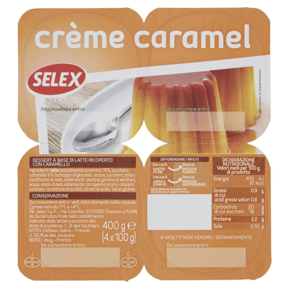 Latte parzialmente scremato 76% Zucchero Caramello 6% (sciroppo di glucosio, acqua, zucchero, amido modificato di mais, addensanti: pectina, gomma di xanthan) Acqua Amido di mais Addensante: carragenina Aroma Coloranti: caroteni Correttore di acidità: citrato di sodio Senza glutine