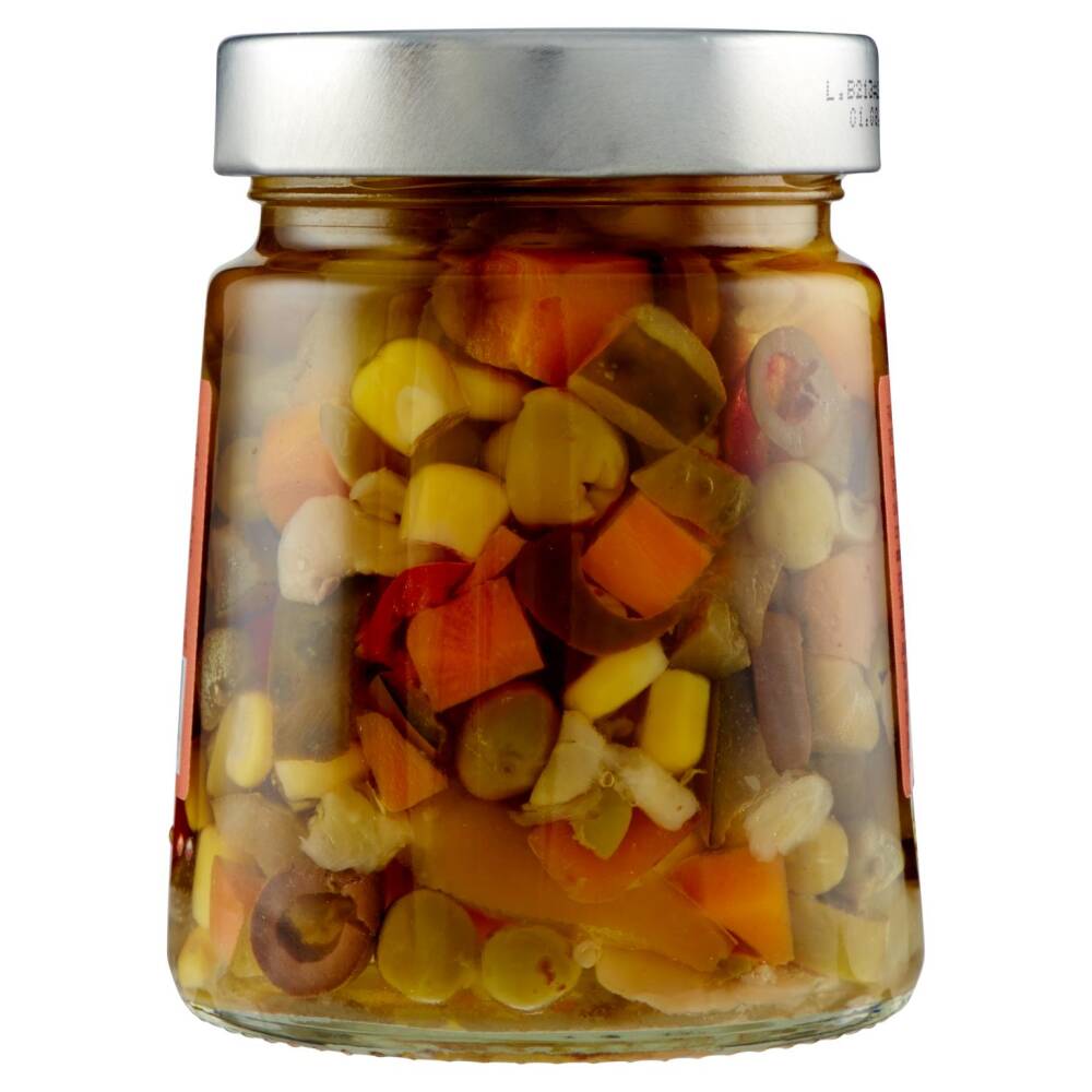 Ortaggi in proporzione variabile (peperoni, cetrioli, carote, cipolline, rape, olive verdi a rondelle, olive nere a rondelle, carciofi, capperi, piselli, mais, antiossidante: anidride solforosa) 60,7% Olio di semi di girasole Funghi prataioli coltivati "Agaricus bisporus" Aceto di vino Sale Correttore di acidità: acido citrico Antiossidante: acido ascorbico Aromi Senza glutine
