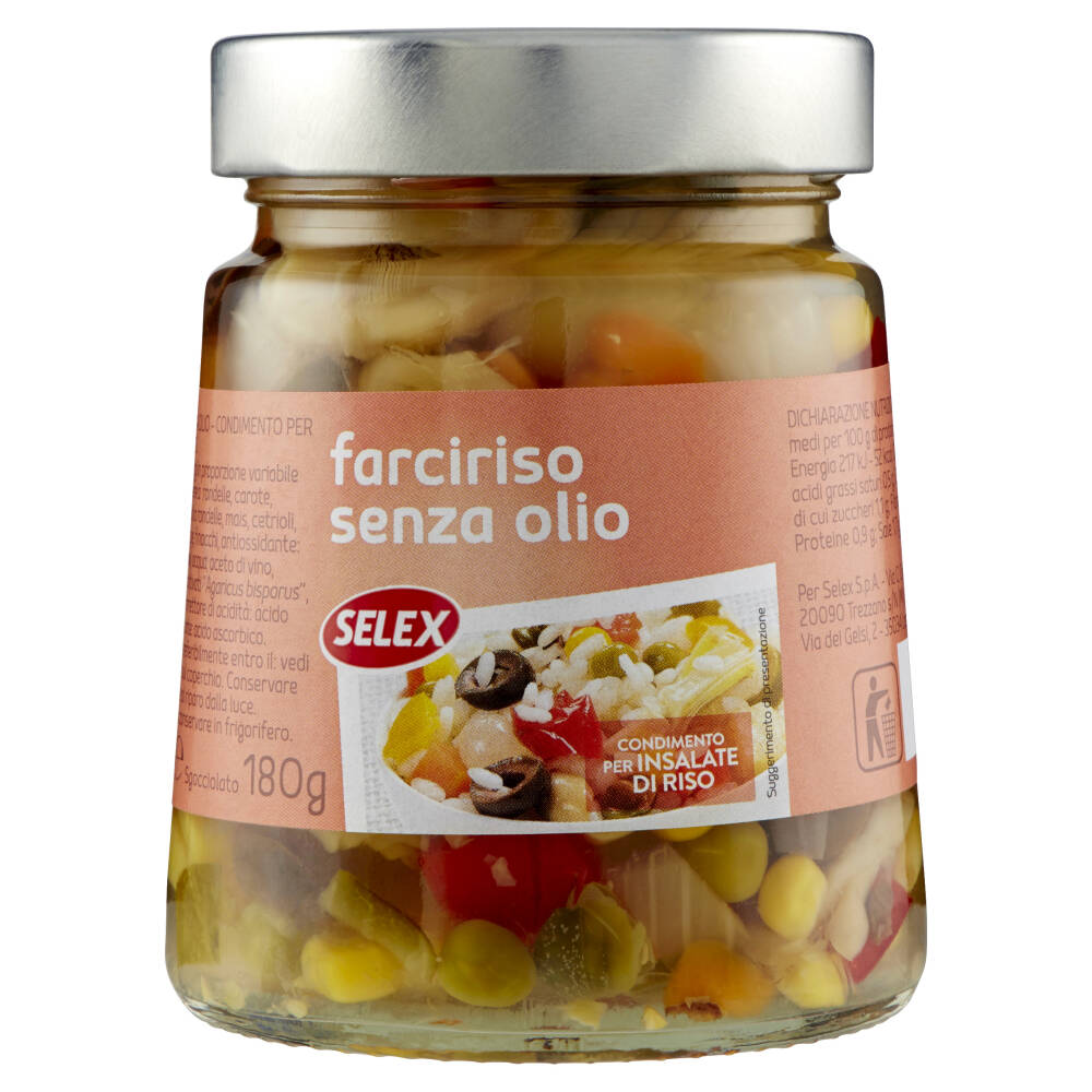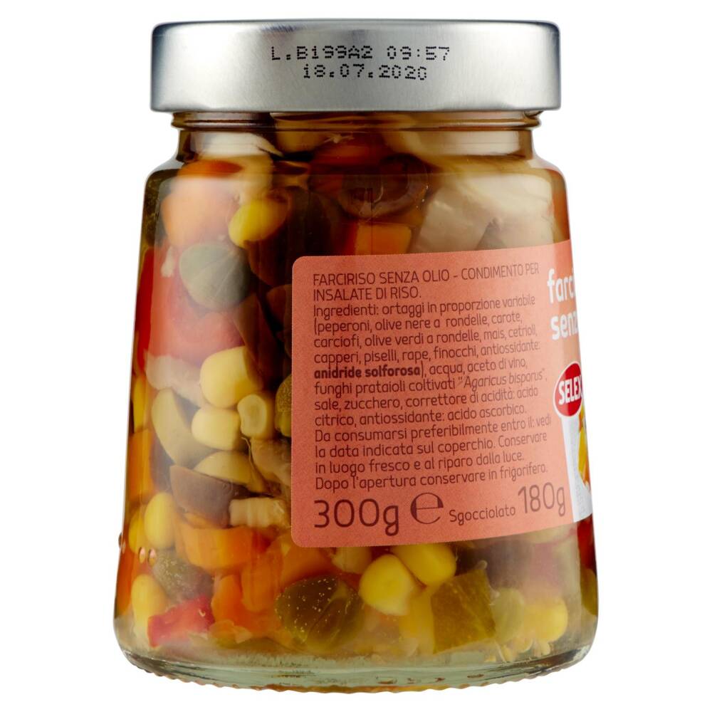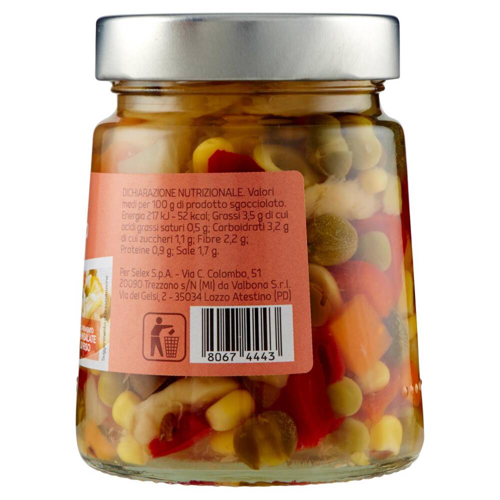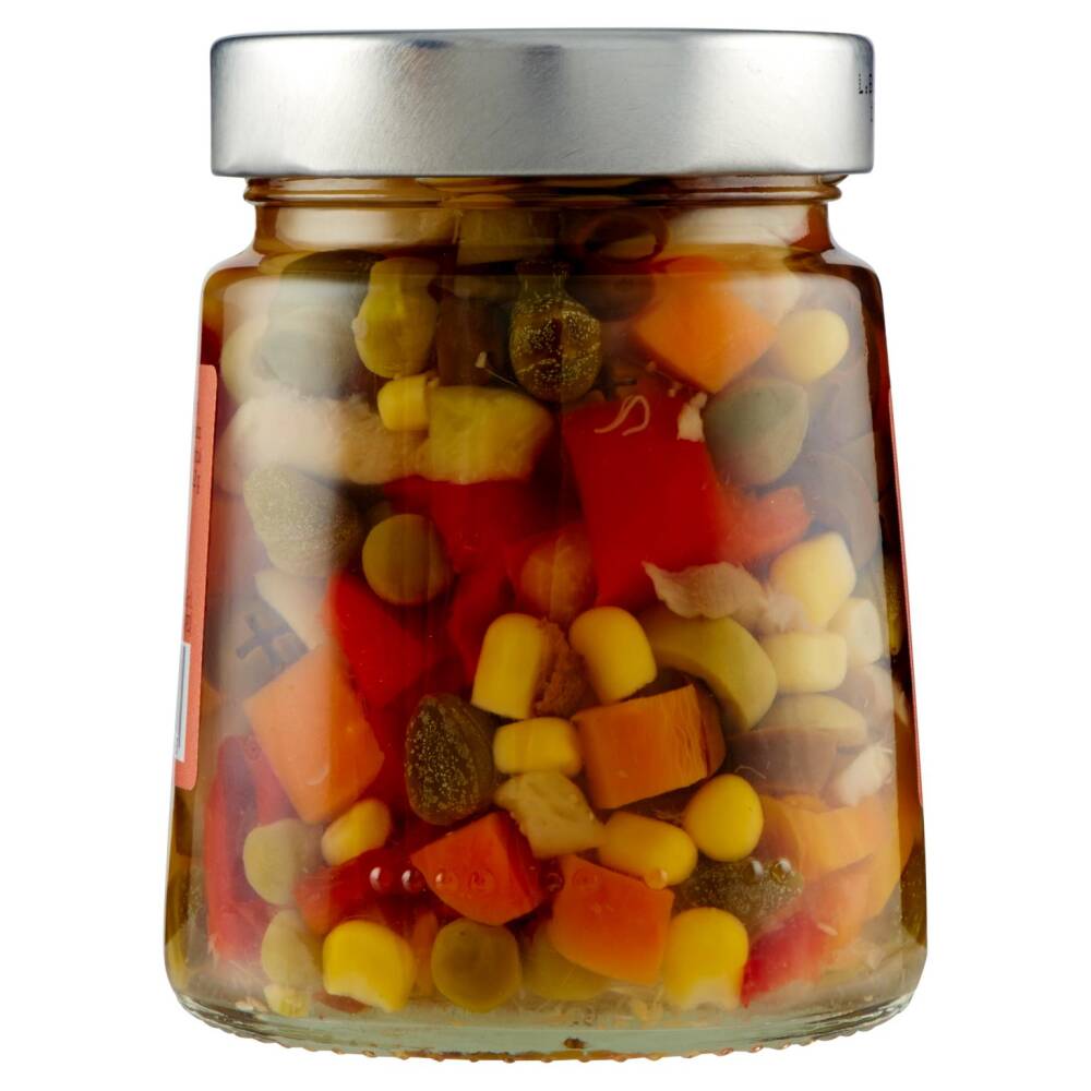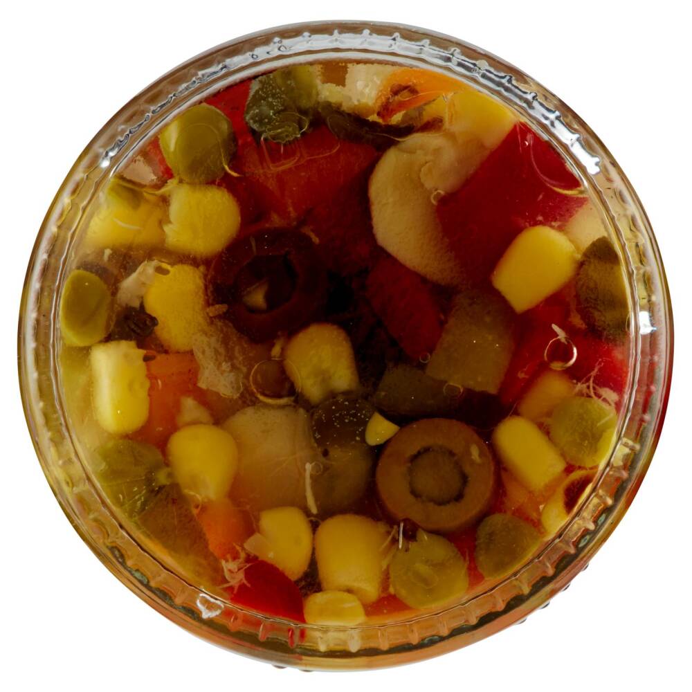 Ortaggi in proporzione variabile (peperoni, olive nere a rondelle, carote, carciofi, olive verdi a rondelle, mais, cetrioli, capperi, piselli, rape, finocchi, antiossidante: anidride solforosa)
