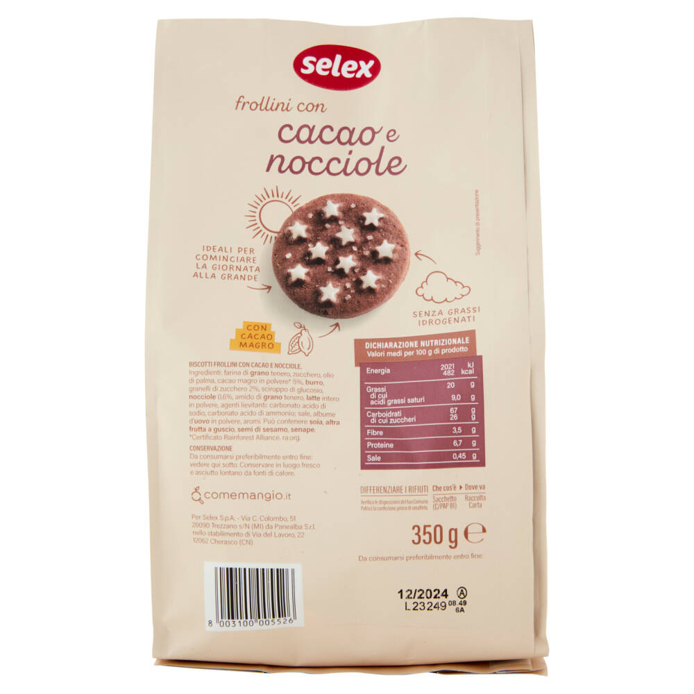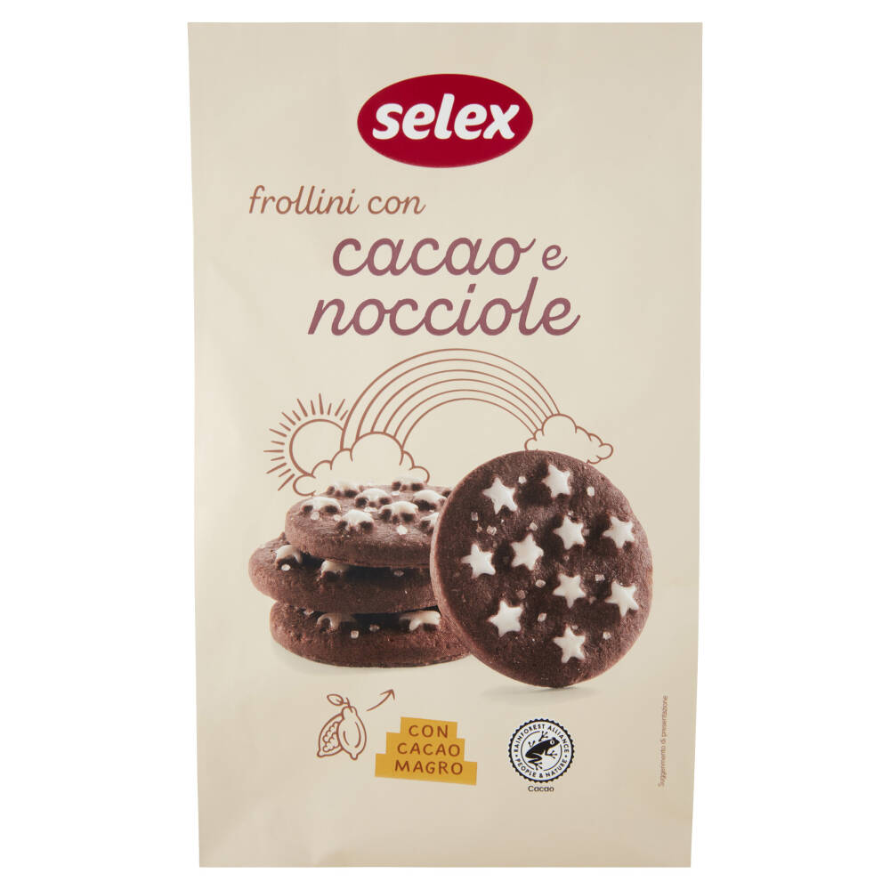 Farina di grano tenero Zucchero Olio di palma Cacao magro in polvere* 5% Burro Granelli di zucchero 2% Sciroppo di glucosio Nocciole 0,6% Amido di grano tenero Latte intero in polvere Agenti lievitanti: carbonato acido di sodio, carbonato acido di ammonio Sale Albume d'uovo in polvere Aromi Può contenere soia, altra frutta a guscio, semi di sesamo, senape *Certificato Rainforest Alliance. ra.org