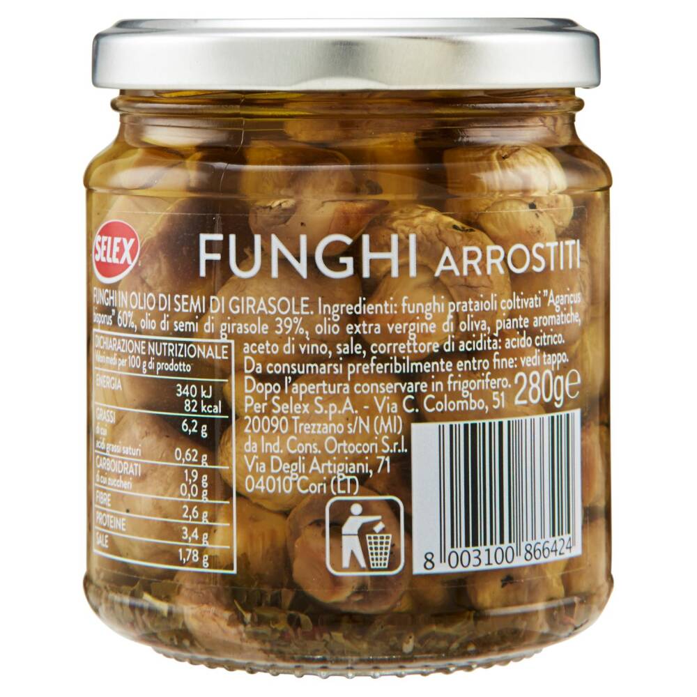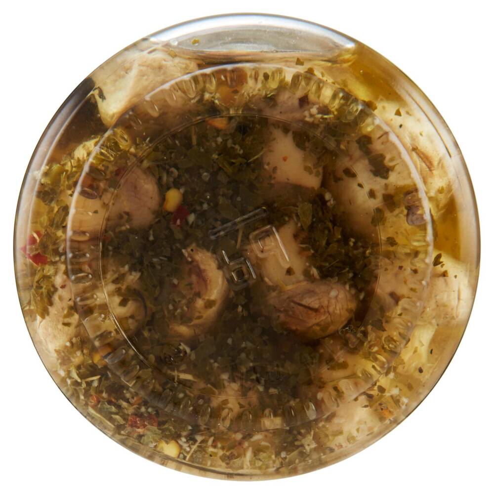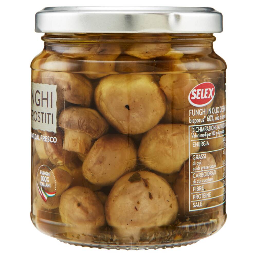 Funghi prataioli coltivati "Agaricus bisporus" 60% Olio di semi di girasole 39% Olio extra vergine di oliva Piante aromatiche Aceto di vino Sale Correttore di acidità: acido citrico