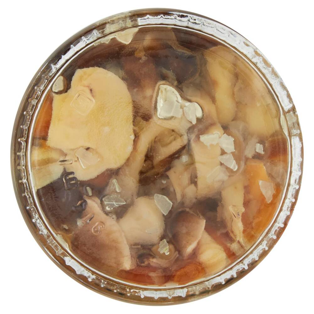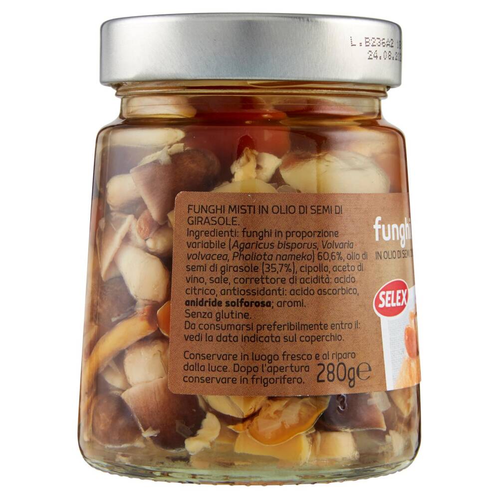 Funghi in proporzione variabile (Agaricus bisporus, Volvaria volvacea, Pholiota nameko) 60,6% Olio di semi di girasole (35,7%) Cipolla Aceto di vino Sale Correttore di acidità: acido citrico Antiossidanti: acido ascorbico, anidride solforosa Aromi Senza glutine