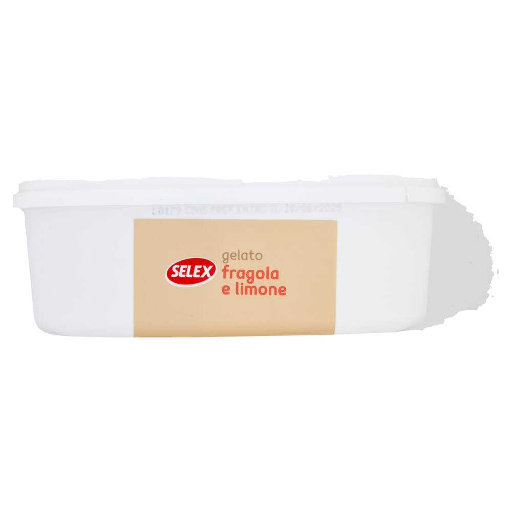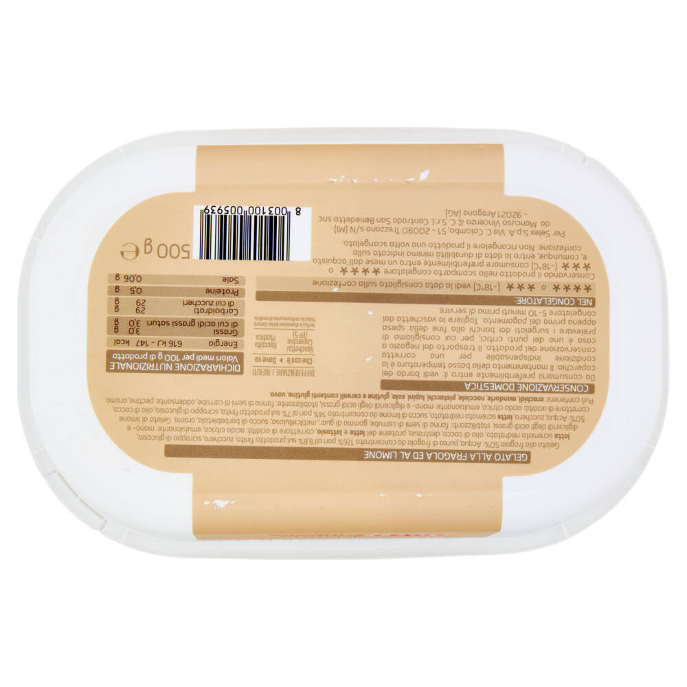 Gelato al limone 50%: acqua, zucchero, latte scremato reidratato, succo di limone da concentrato 14% pari al 7% sul prodotto finito, sciroppo di glucosio, olio di cocco, correttore di acidità: acido citrico, emulsionante: mono-e digliceridi degli acidi grassi, stabilizzante: farina di semi carrube, addensante: pectine, aroma