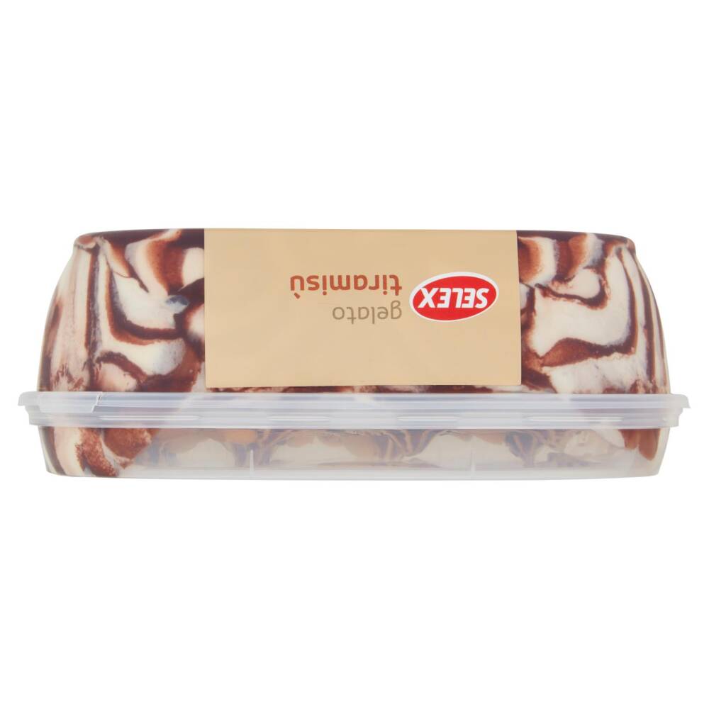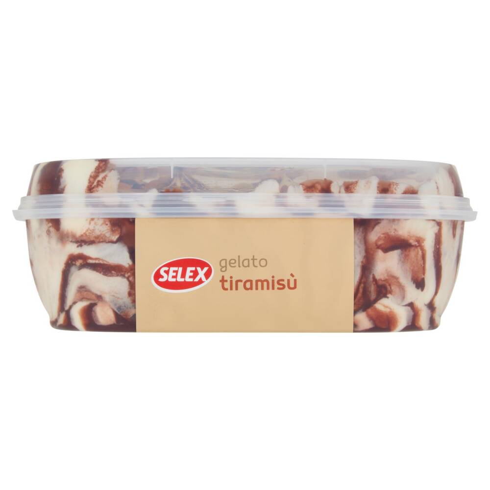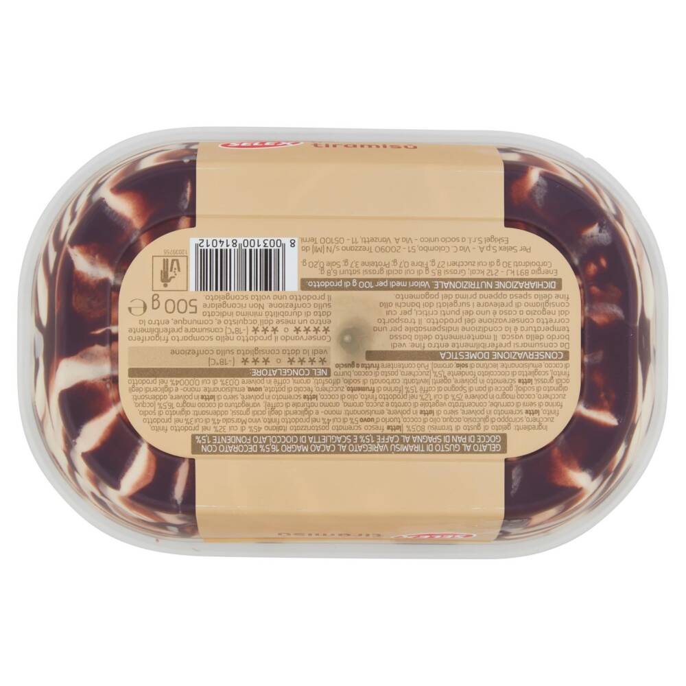 Gelato al gusto di tiramisù 80,5% (latte fresco scremato pastorizzato italiano 45% di cui 32% nel prodotto finito, zucchero, sciroppo di glucosio, acqua, olio di cocco, tuorlo d'uovo 5% di cui 4% nel prodotto finito, vino Marsala 4% di cui 3% nel prodotto finito, latte scremato in polvere, siero di latte in polvere, emulsionanti: mono- e digliceridi degli acidi grassi, addensanti: alginato di sodio, farina di semi di carrube, concentrato vegetale di carota e zucca, aroma, aroma naturale di caffè)