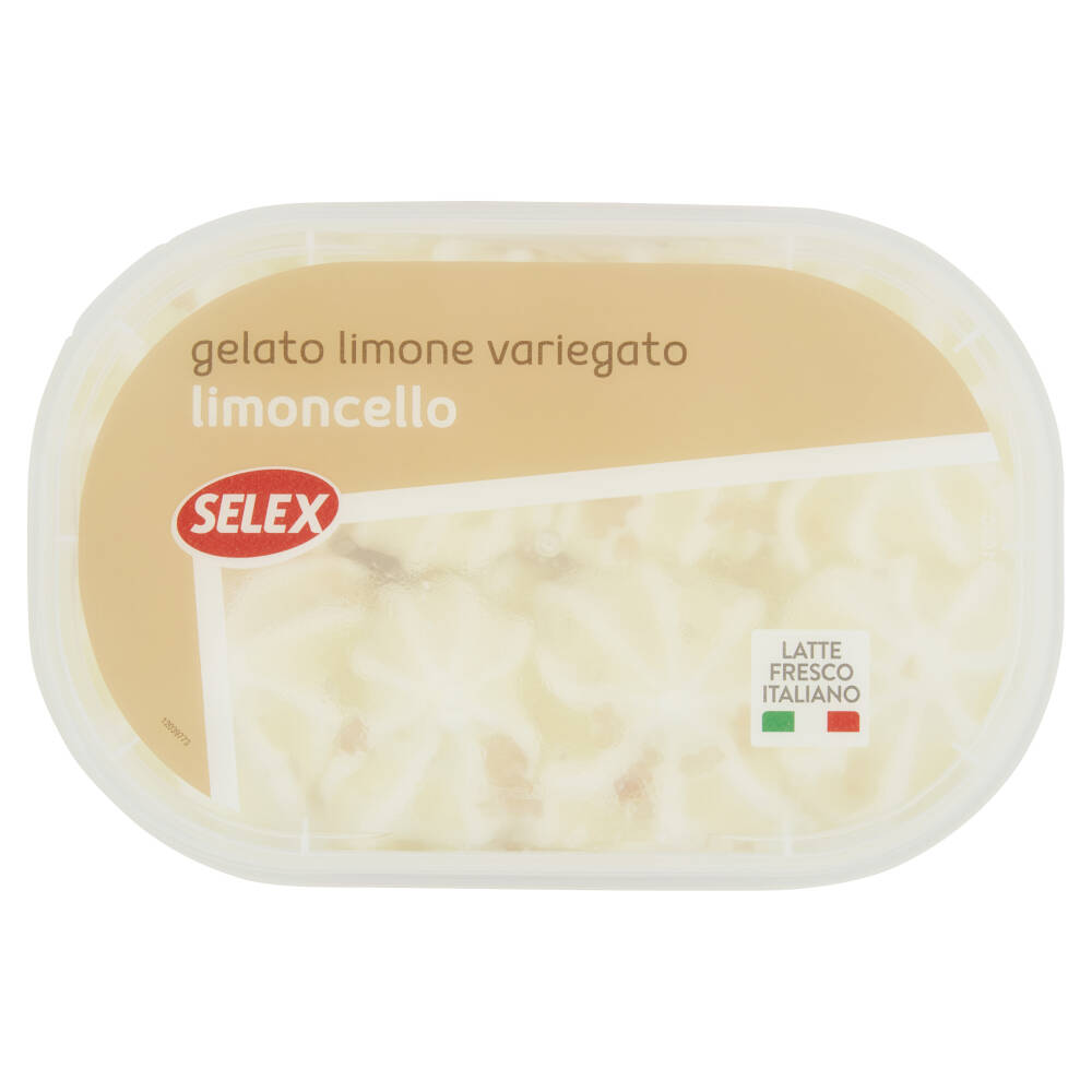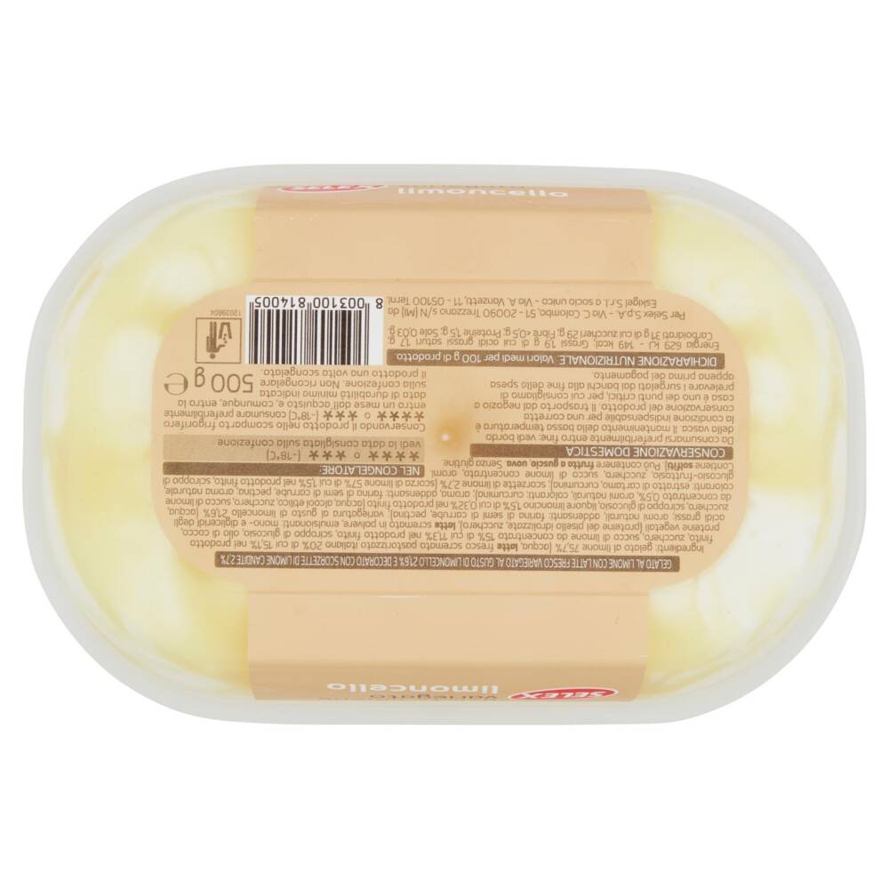 Variegatura al gusto di limoncello 21,6% (acqua, zucchero, sciroppo di glucosio, liquore limoncino 1,5% di cui 0,32% nel prodotto finito (acqua, alcool etilico, zucchero, succo di limone da concentrato 0,5%, aromi naturali, coloranti: curcumina); aroma, addensanti: farina di semi di carube, pectina; aroma naturale, coloranti: estratto di cartamo, curcumina)