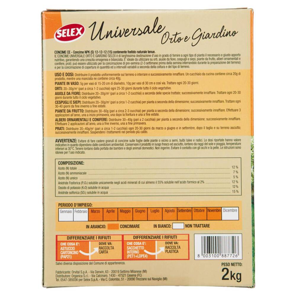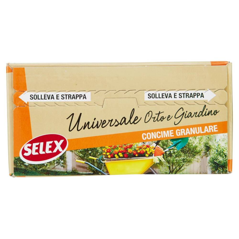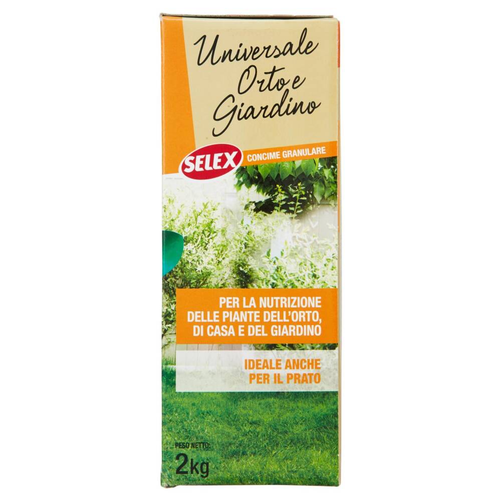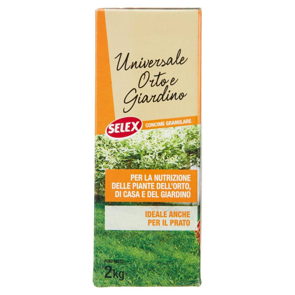 Il Concime Universale Orto e Giardino Selex è di larghissima destinazione d'uso in grado di fornire a ogni tipo di piante il necessario e giusto apporto nutritivo, garantendo una crescita omogenea e bilanciata. E' ideale da utilizzare su orti, aiuole da fiore, cespugli e siepi, piante da frutto, alberi ornamentali e conifere, prati; può essere utilizzato per la concimazione di pre-semina (2-3 settimane prima della semina interrandolo durante la preparazione del terreno) e per la concimazione di copertura in quantità ed a intervalli variabili a seconda della coltura e del tipo di terreno.