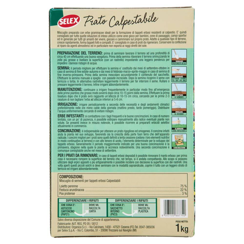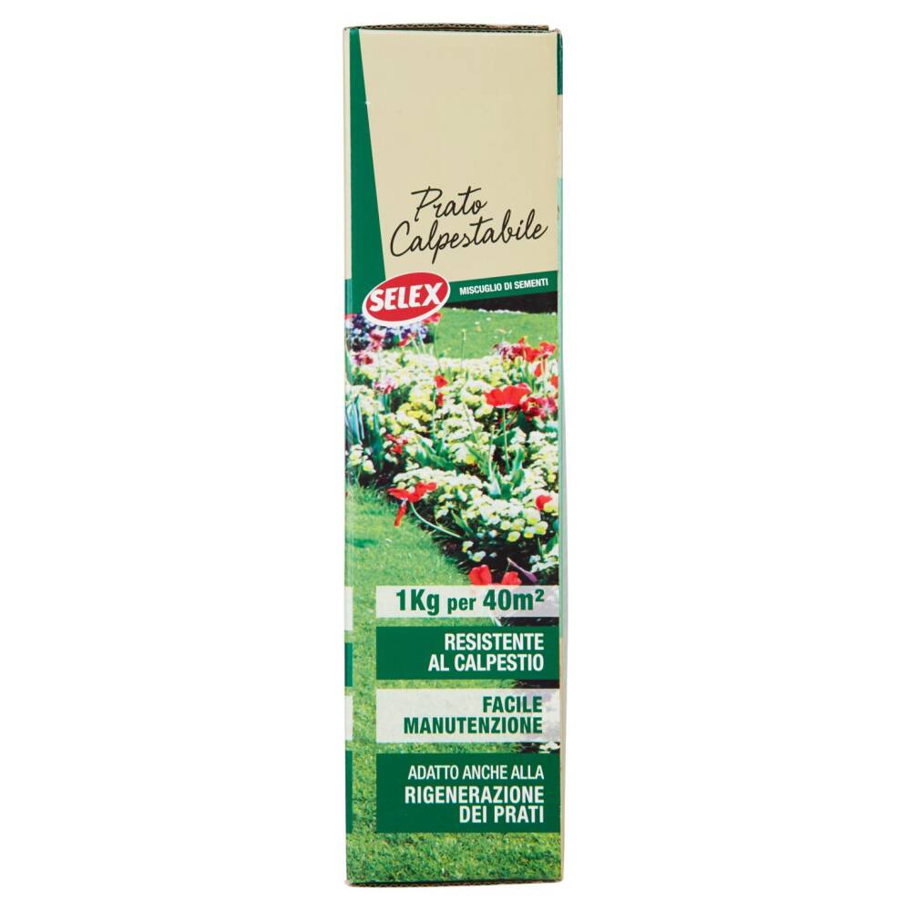 Miscuglio preparato con erbe graminacee ideali per la formazione di tappeti erbosi resistenti al calpestio. E' quindi consigliato per tutte quelle situazioni di inteso utilizzo come aree gioco per bambini, zone di passaggio, campi sportivi ed in generale per tutti gli amanti del vivere, giocare e camminare sul proprio prato. Adatto a qualsiasi tipo di terreno, cresce rapidamente, forma tappeti folti e compatti. E' consigliato in caso di prati da rigenerare. Conservare la confezione al riparo da agenti atmosferici ed in particolare non esporla ai raggi diretti del sole.