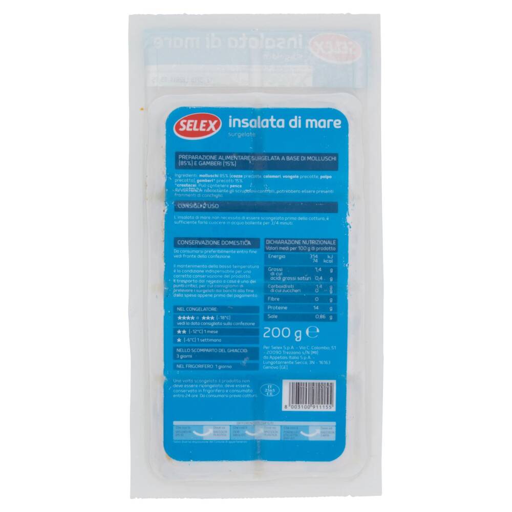 L'insalata di mare non necessita di essere scongelata prima della cottura, è sufficiente farla cuocere in acqua bollente per 3/4 minuti.