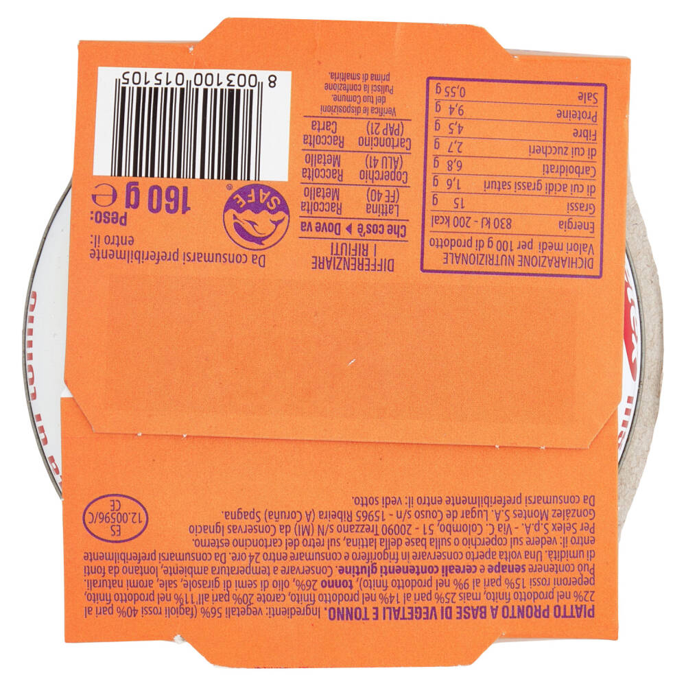 Vegetali 56% (fagioli rossi 40% pari al 22% nel prodotto finito, mais 25% pari al 14% nel prodotto finito, carote 20% pari all' 11% nel prodotto finito, peperoni rossi 15% pari al 9% nel prodotto finito) Tonno 26% Olio di semi di girasole Sale Aromi Naturali Può contenere senape e cereali contenenti glutine