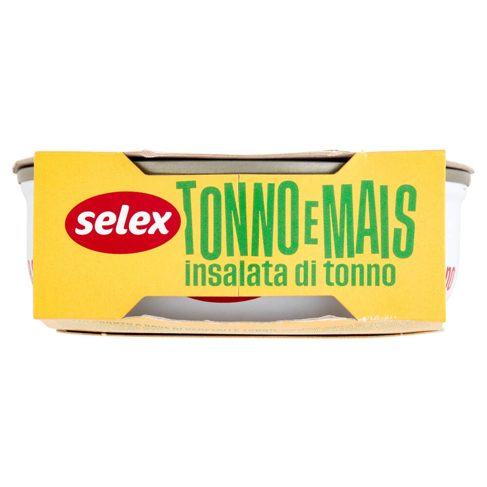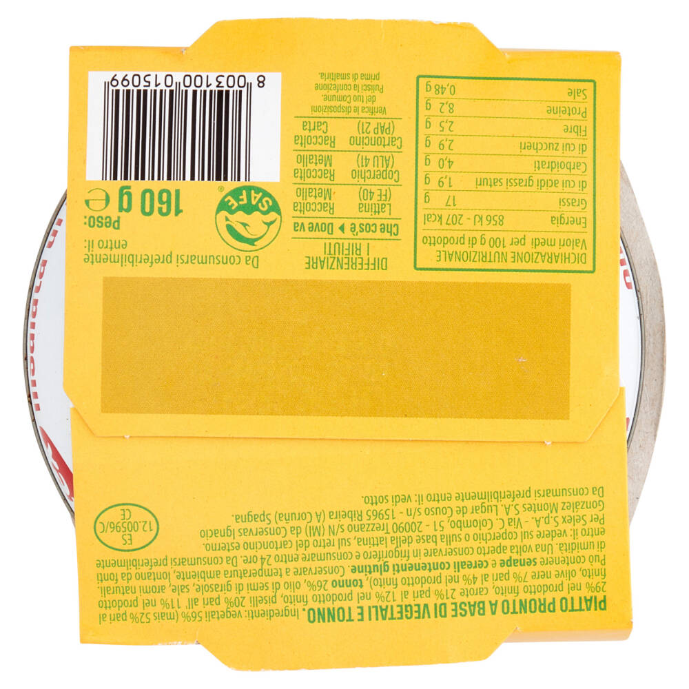 Vegetali 56% (mais 52% pari al 29% nel prodotto finito, carote 21% pari al 12% nel prodotto finito, piselli 20% pari all' 11% nel prodotto finito, olive nere 7% pari al 4% nel prodotto finito) Tonno 26% Olio di semi di girasole Sale Aromi naturali Può contenere senape e cereali contenenti glutine