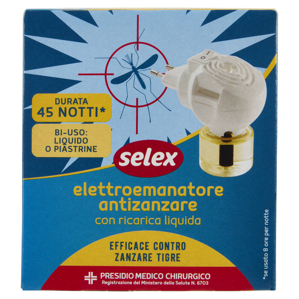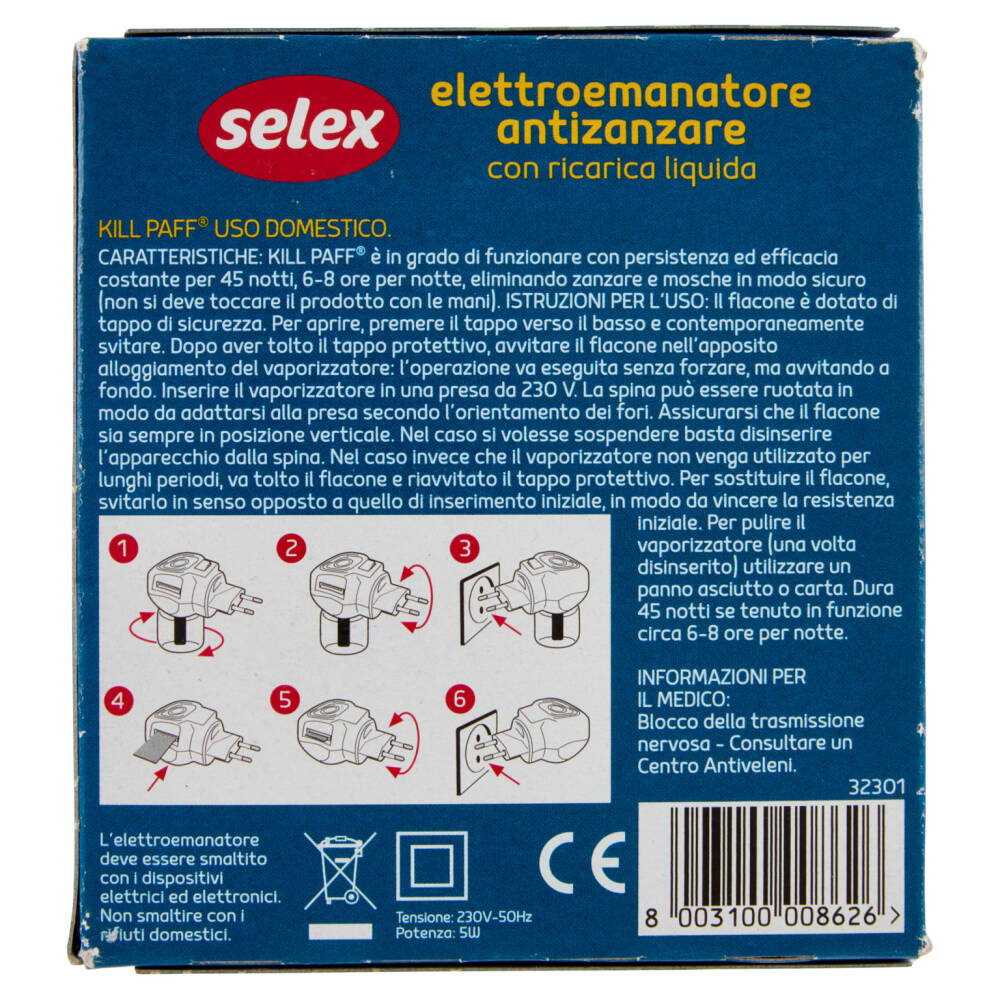 Istruzioni per l'uso: Il flacone è dotato di tappo di sicurezza. Per aprire, premere il tappo verso il basso e contemporaneamente svitare. Dopo aver tolto il tappo protettivo, avvitare il flacone nell'apposito alloggiamento del vaporizzatore: l'operazione va eseguita senza forzare, ma avvitando a fondo. Inserire il vaporizzatore in una presa da 230 V. La spina può essere ruotata in modo da adattarsi alla presa secondo l'orientamento dei fori. Assicurarsi che il flacone sia sempre in posizione verticale. Nel caso si volesse sospendere basta disinserire l'apparecchio dalla spina. Nel caso invece che il vaporizzatore non venga utilizzato per lunghi periodi, va tolto il flacone e riavvitato il tappo protettivo. Per sostituire il flacone, svitarlo in senso opposto a quello di inserimento iniziale, in modo da vincere la resistenza iniziale. Per pulire il vaporizzatore (una volta disinserito) utilizzare un panno asciutto o carta. Dura 45 notti se tenuto in funzione circa 6-8 ore per notte.