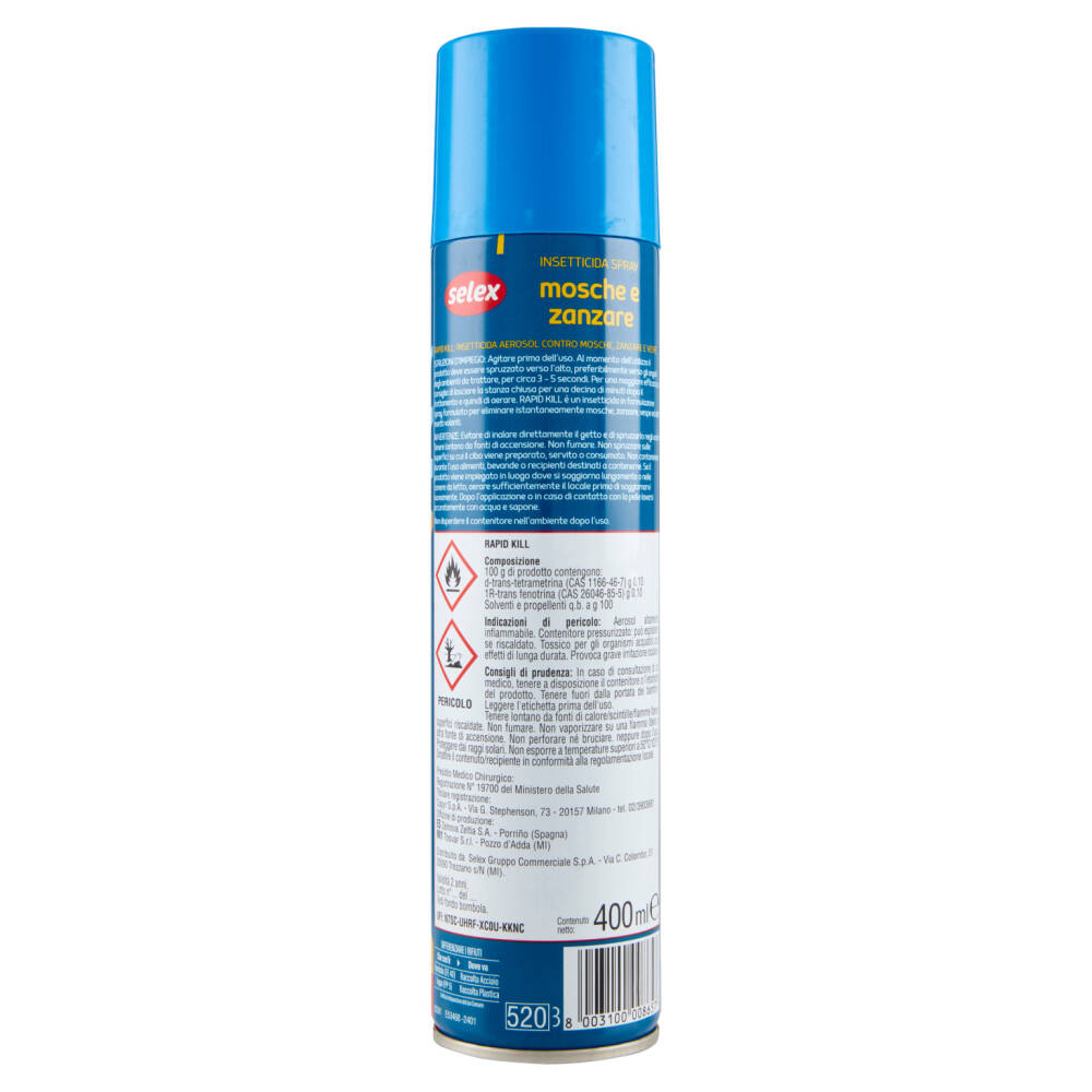 Istruzioni d'impiego: Agitare prima dell'uso. Al momento dell'utilizzo il prodotto deve essere spruzzato verso l'alto, preferibilmente verso gli angoli degli ambienti da trattare, per circa 3 - 5 secondi. Per una maggiore efficacia, si consiglia di lasciare la stanza chiusa per una decina di minuti dopo il trattamento e quindi di aerare. Rapid Kill è un insetticida in formulazione spray formulato per eliminare istantaneamente mosche, zanzare, vespe ed altri insetti volanti.