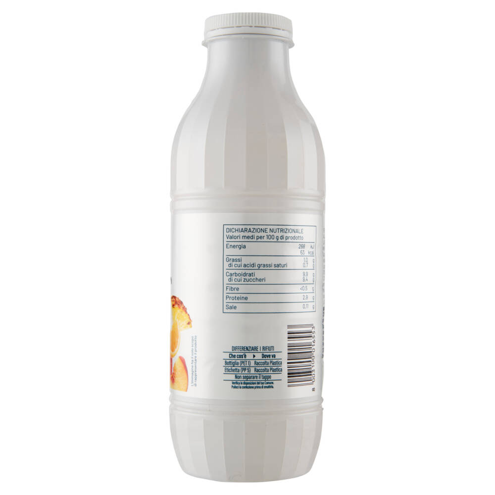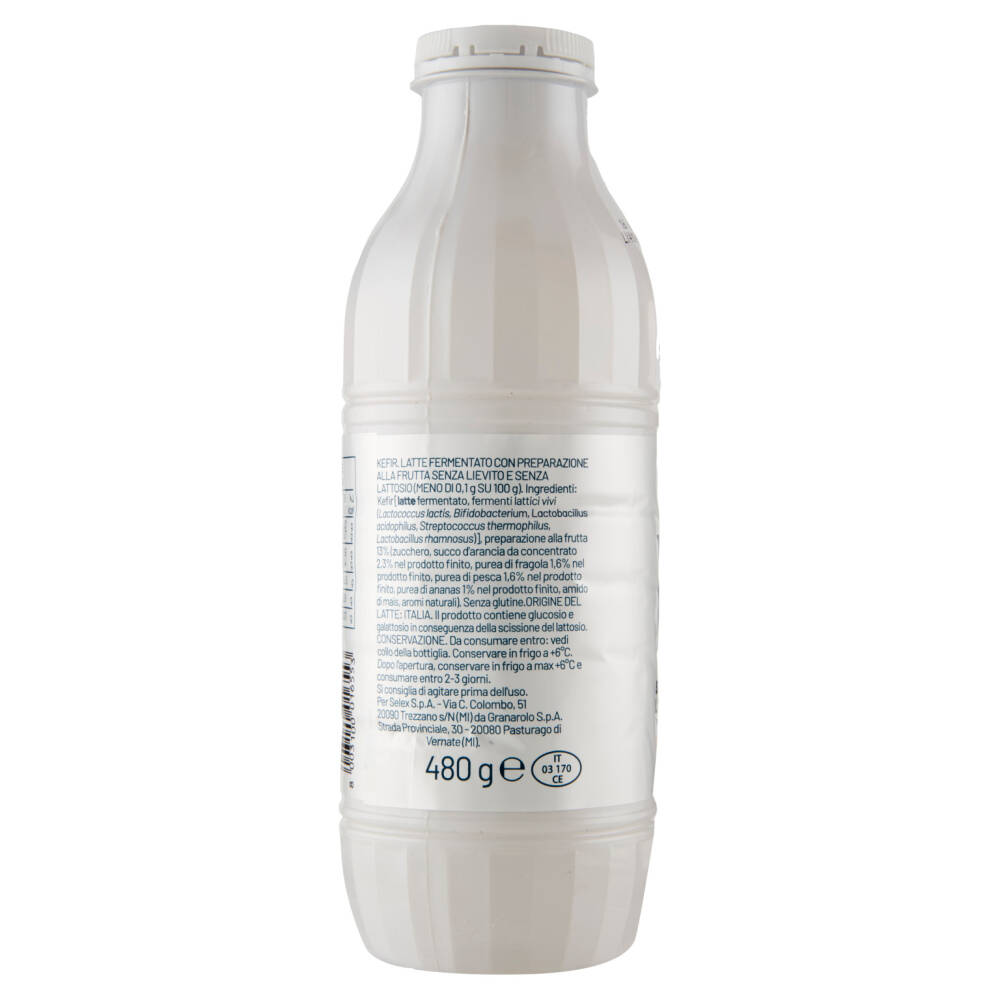Kefir [latte fermentato, fermenti lattici vivi (Lactococcus lactis, Bifidobacterium, Lactobacillus acidophilus, Streptococcus thermophilus, Lactobacillus rhamnosus)] Preparazione alla frutta 13% (zucchero, succo d'arancia da concentrato 2,3% nel prodotto finito, purea di fragola 1,6% nel prodotto finito, purea di pesca 1,6% nel prodotto finito, purea di ananas 1% nel prodotto finito, amido di mais, aromi naturali) Senza glutine