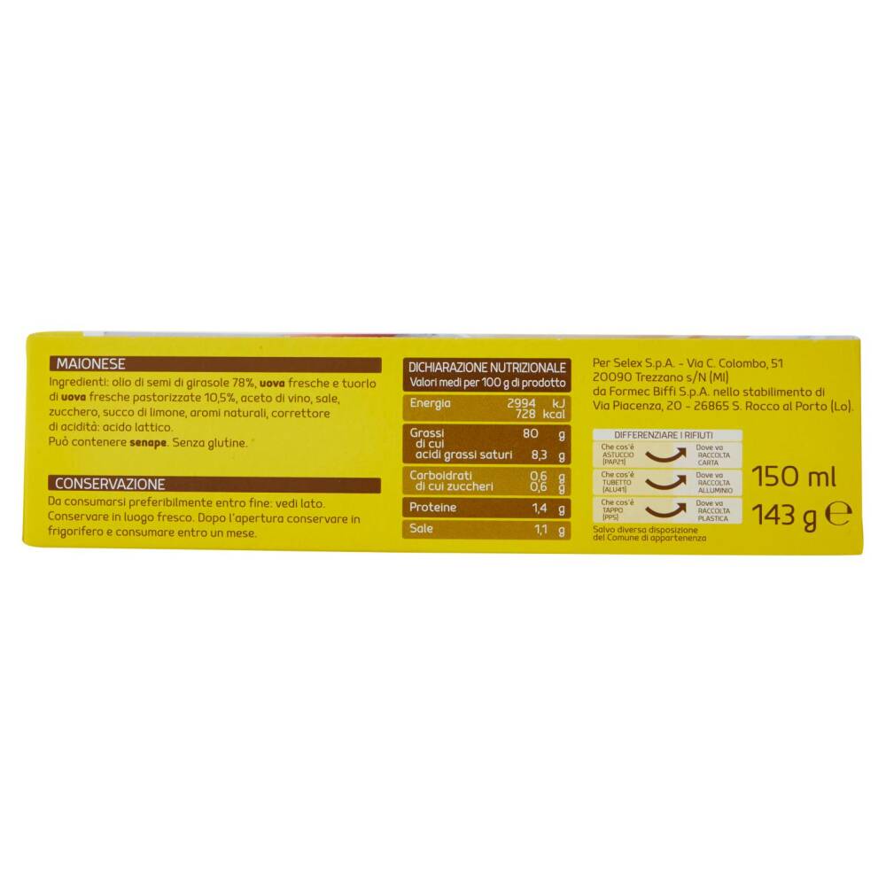 Olio di semi di girasole 78% Uova fresche e tuorlo di uova fresche pastorizzate 10,5% Aceto di vino Sale Zucchero Succo di limone Aromi naturali Correttore di acidità: acido lattico Può contenere senape Senza glutine