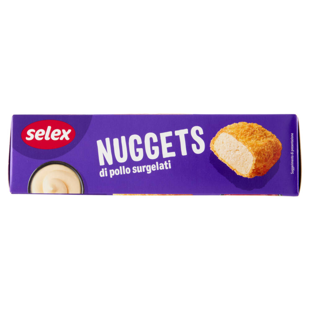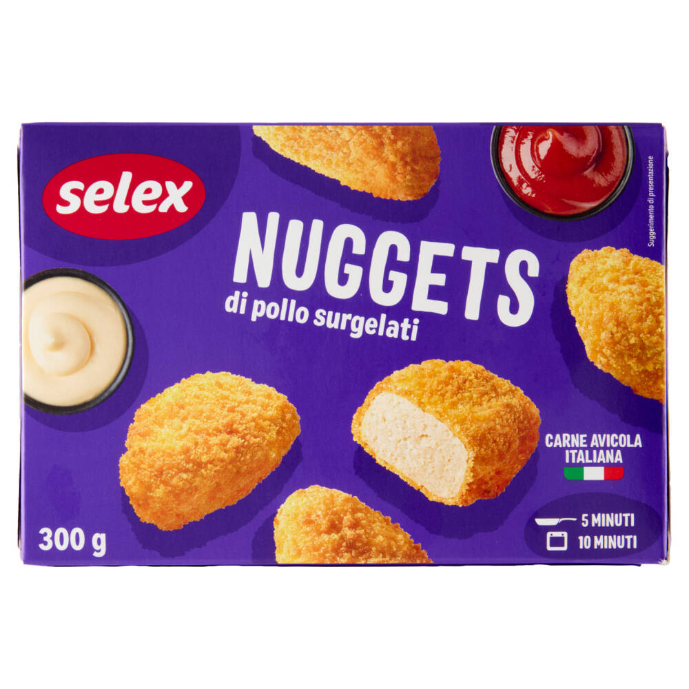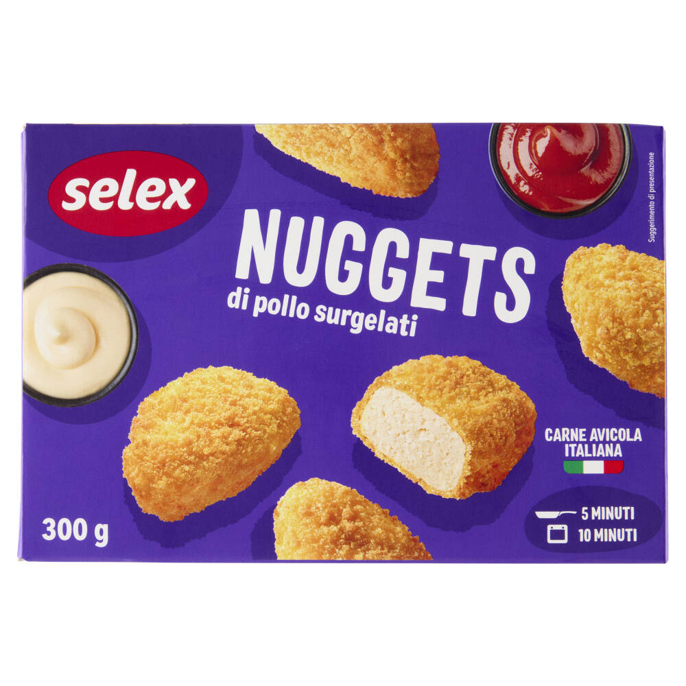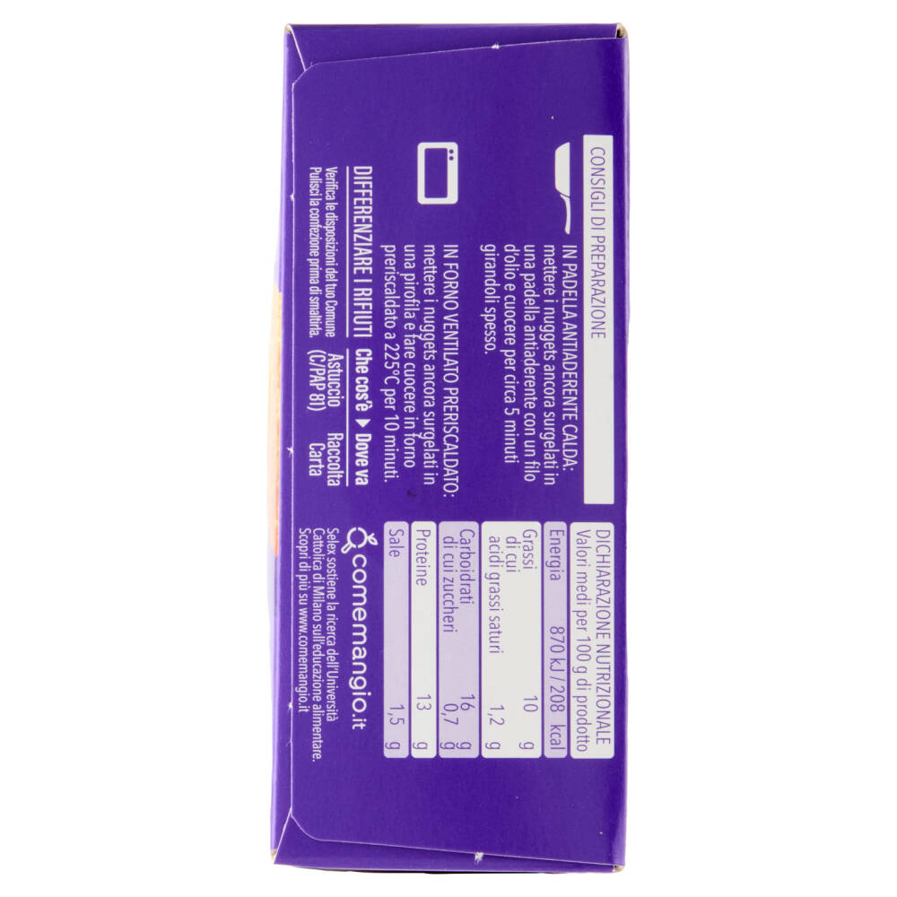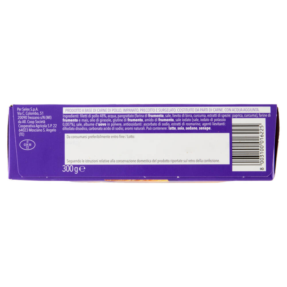 Filetti di pollo 48% Acqua Pangrattato (farina di frumento, sale, lievito di birra, curcuma, estratti di spezie: paprica, curcuma) Farine di frumento e mais Olio di girasole Glutine di frumento Amido di frumento Sale iodato (sale, iodato di potassio 0,007%) Sale Albume d'uovo in polvere Antiossidanti: ascorbato di sodio, estratti di rosmarino Agenti lievitanti: difosfato disodico, carbonato acido di sodio Aromi naturali Può contenere: latte, soia, sedano, senape