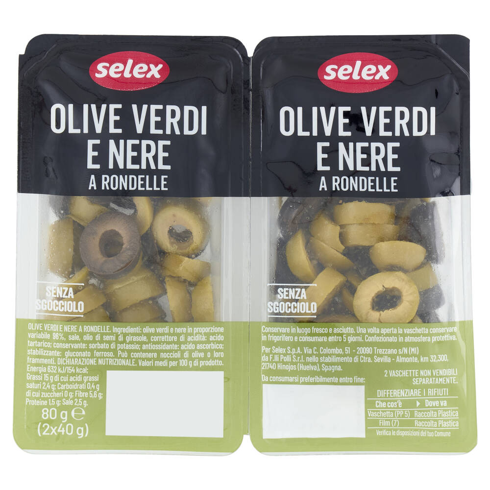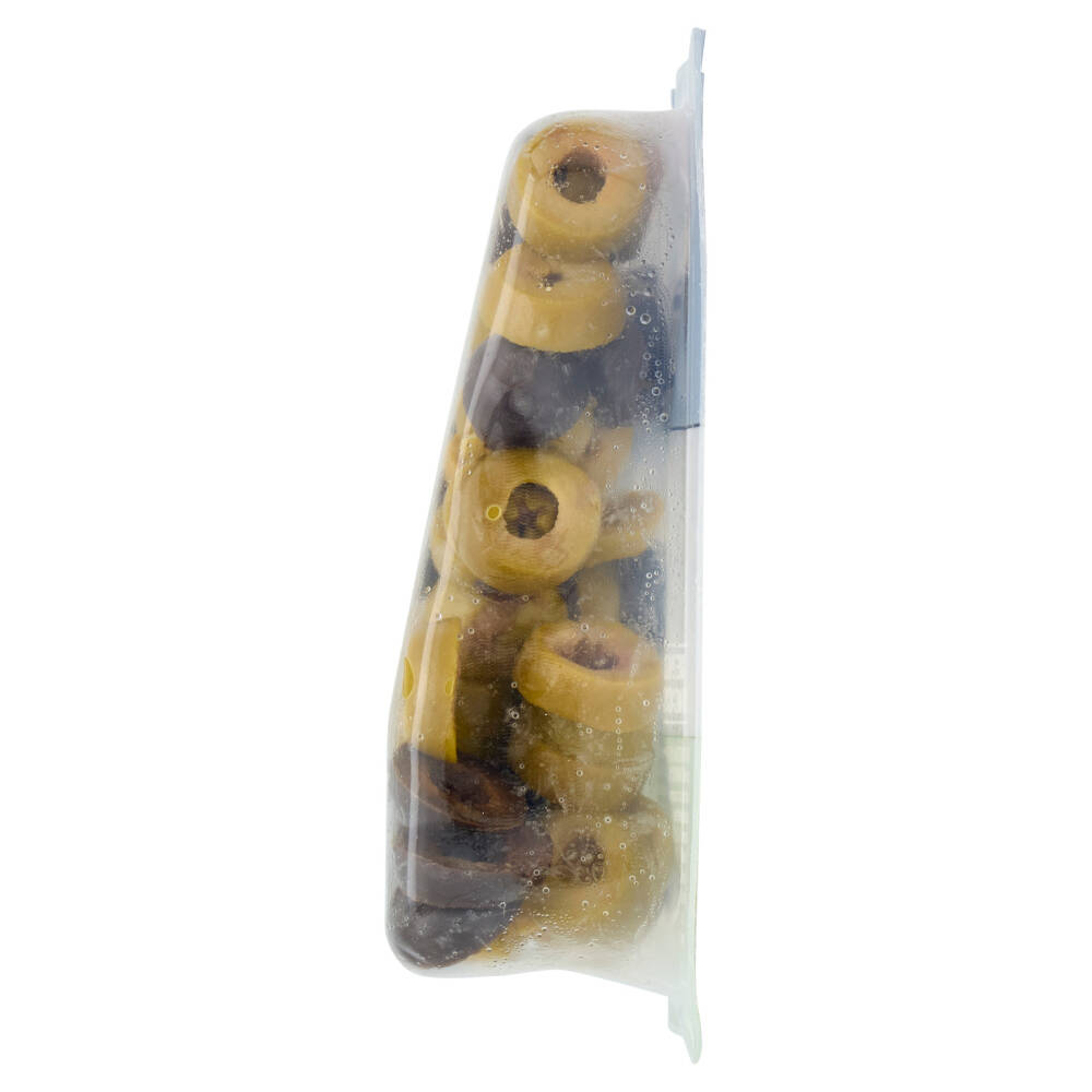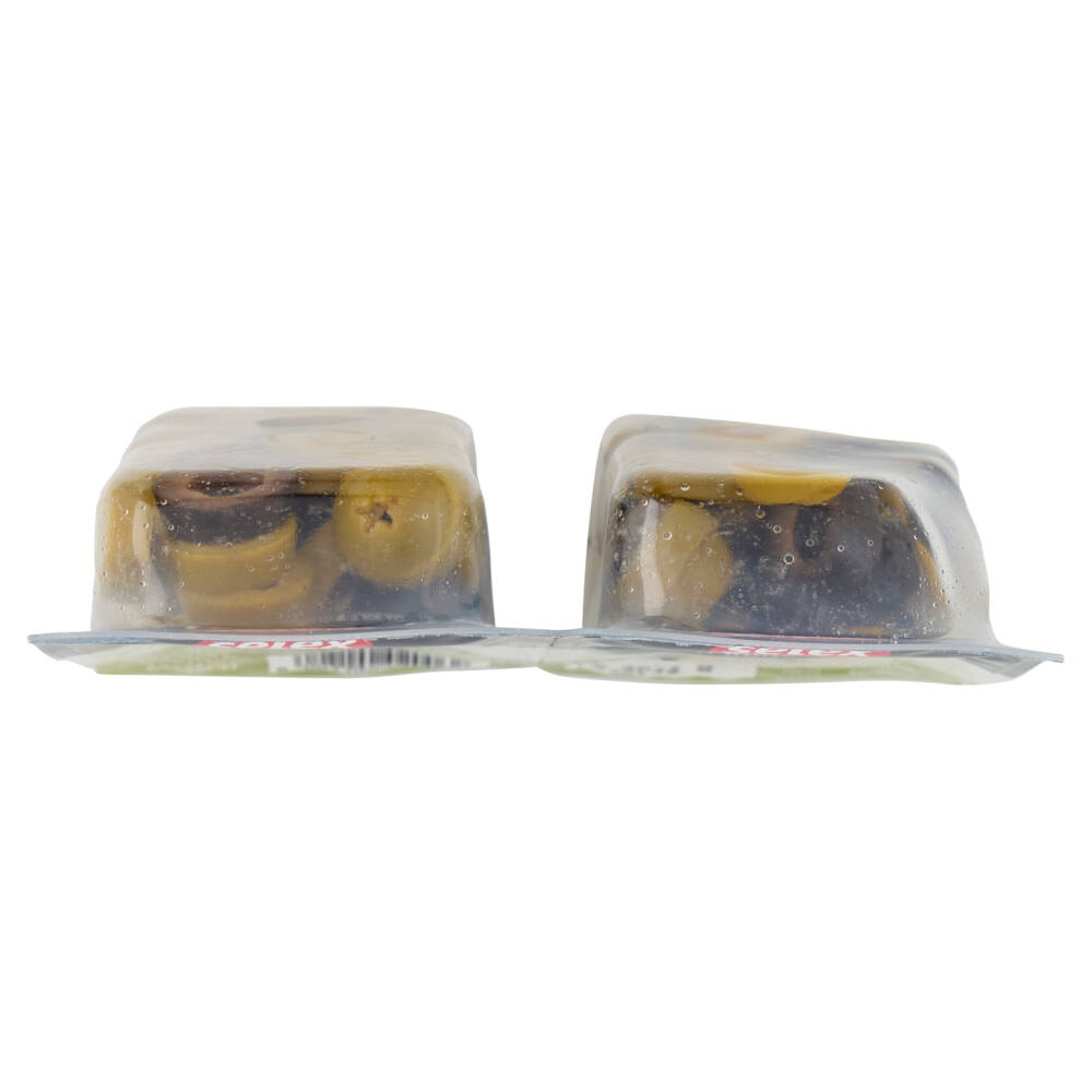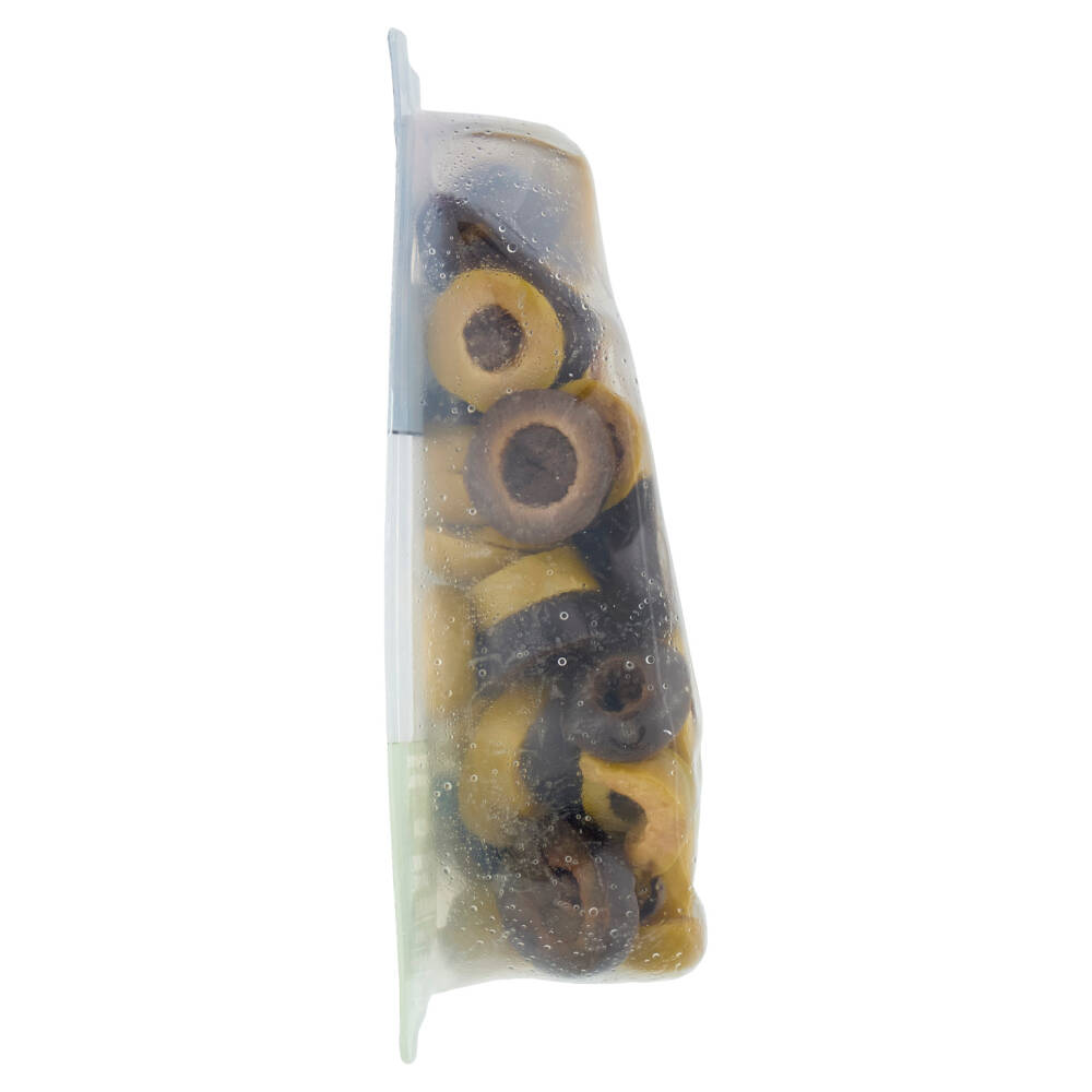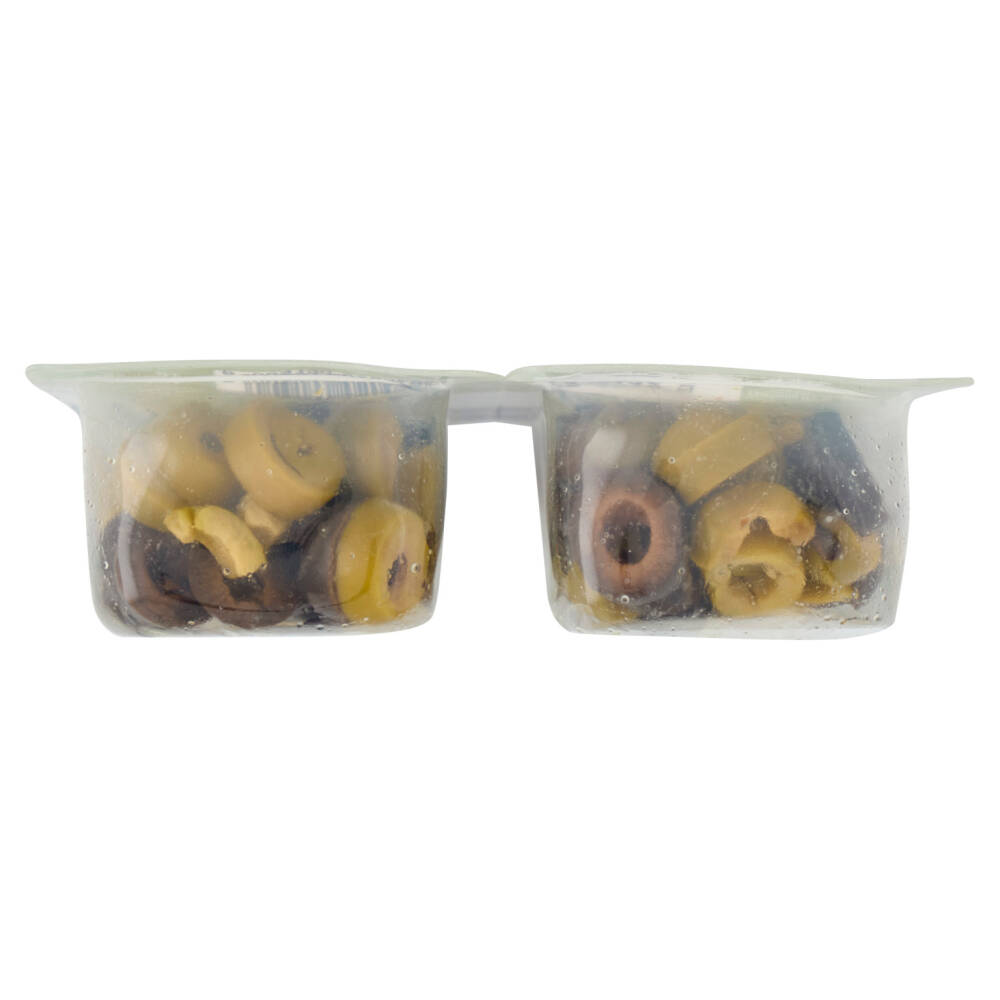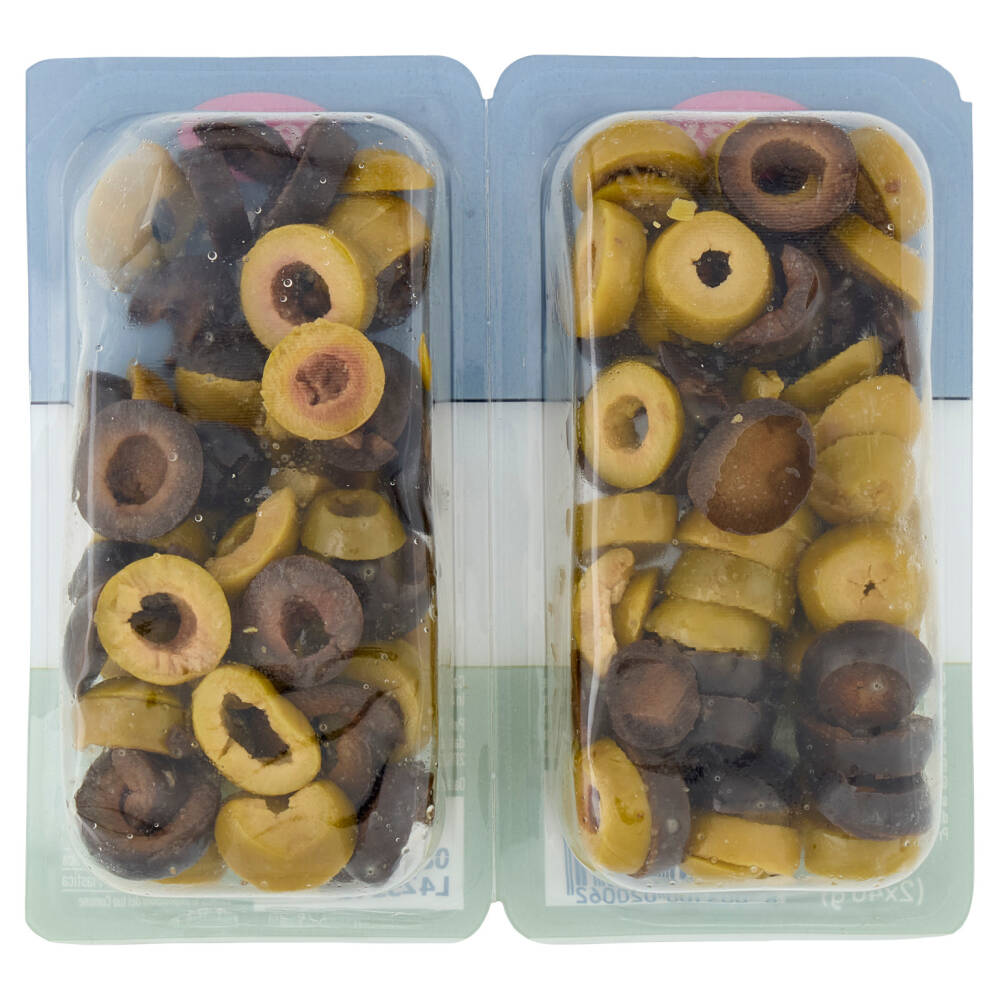 Olive verdi e nere in proporzione variabile 96% Sale Olio di semi di girasole Correttore di acidità: acido tartarico Conservante: sorbato di potassio Antiossidante: acido ascorbico Stabilizzante: gluconato ferroso Può contenere noccioli di olive o loro frammenti