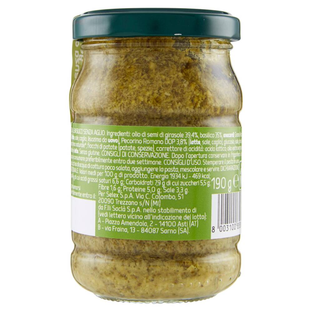 Olio di semi di girasole 39,4% Basilico 35% Anacardi Grana Padano DOP 3,8% (latte, sale, caglio, lisozima da uovo) Pecorino Romano DOP 3,8% (latte, sale, caglio) Glucosio Sale Pinoli Siero di latte Aroma naturale* Fiocchi di patate (patate, spezie) Correttore di acidità: acido lattico Olio extra vergine di oliva *Contiene latte Senza glutine
