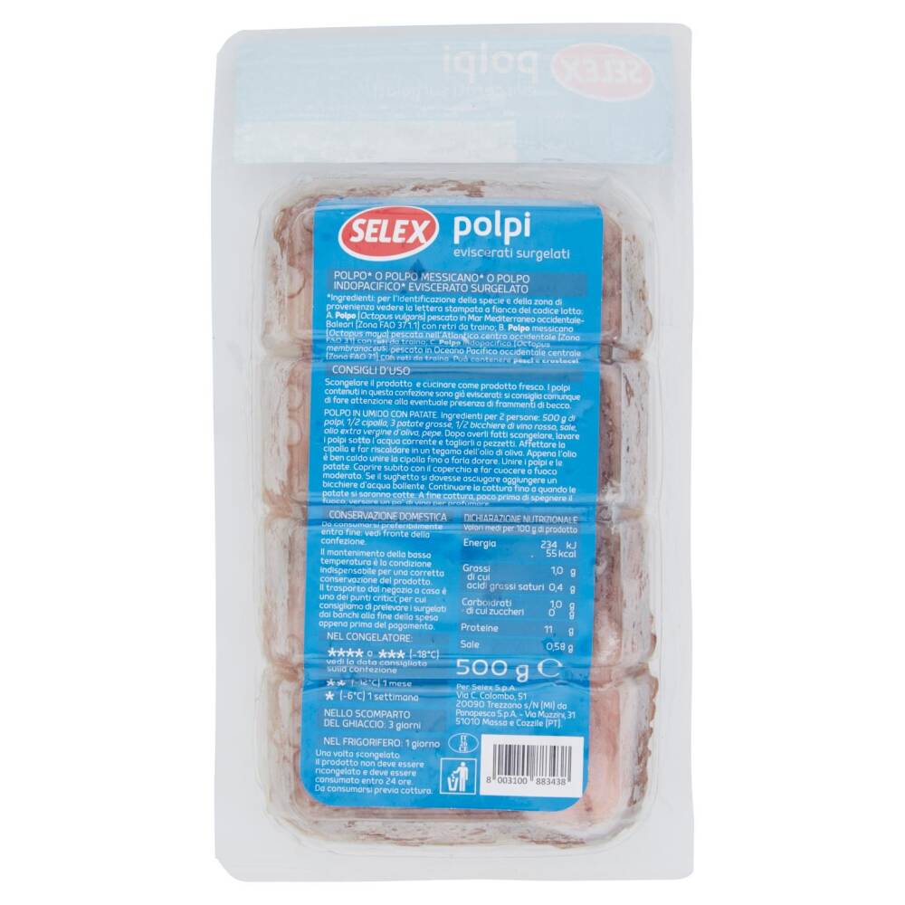 Scongelare il prodotto e cucinare come prodotto fresco. I polpi contenuti in questa confezione sono già eviscerati: si consiglia comunque di fare attenzione alla eventuale presenza di frammenti di becco.