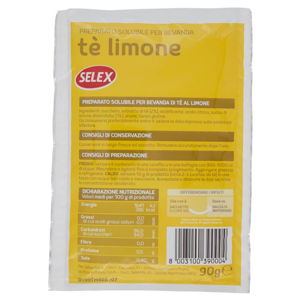 Zucchero Estratto di tè (2%) Acidificante: acido citrico Succo di limone disidratato (1%) Aromi Senza glutine