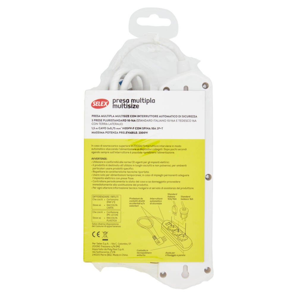 Presa multipla multisize Spina piccola e prese grandi 3 Prese pluristandard Spina 10A collegabile in tutte le prese a muro domestiche 1,5m Cavo 3x0,75 mm² Salvaspazio a 90° Protezione bambini Asole per attacco a muro Interruttore di sicurezza - In caso di sovraccarico interrompe automaticamente l'alimentazione ai dispositivi collegati