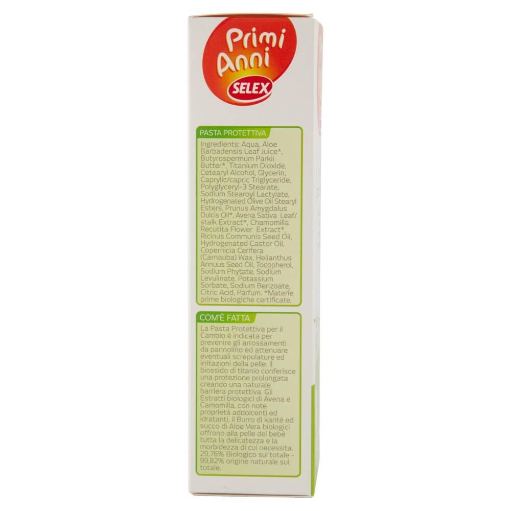 La Pasta Protettiva per il Cambio è indicata per prevenire gli arrossamenti da pannolino ed attenuare eventuali screpolature ed irritazioni della pelle. Il biossido di titanio conferisce una protezione prolungata creando una naturale barriera protettiva. Gli Estratti biologici di Avena e Camomilla, con note proprietà addolcenti ed idratanti, il Burro di karité e succo di Aloe Vera biologici offrono alla pelle del bebè tutta la delicatezza e la morbidezza di cui necessita.