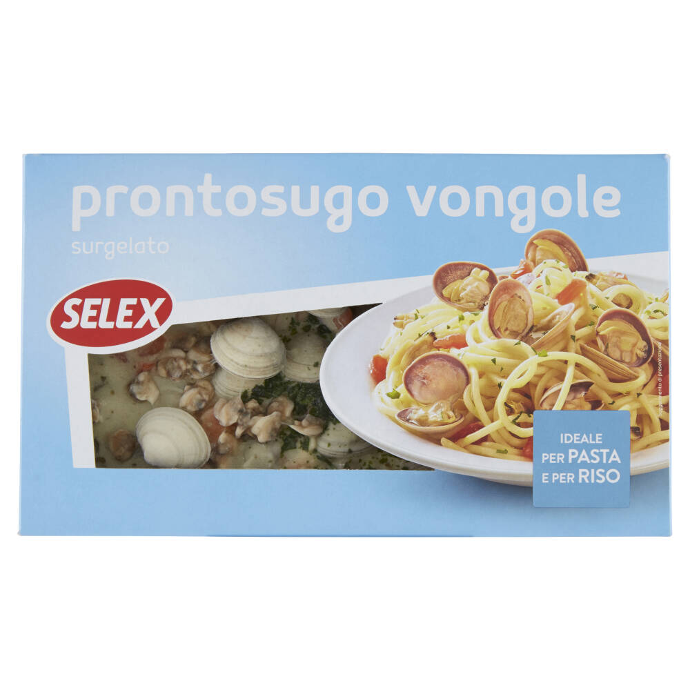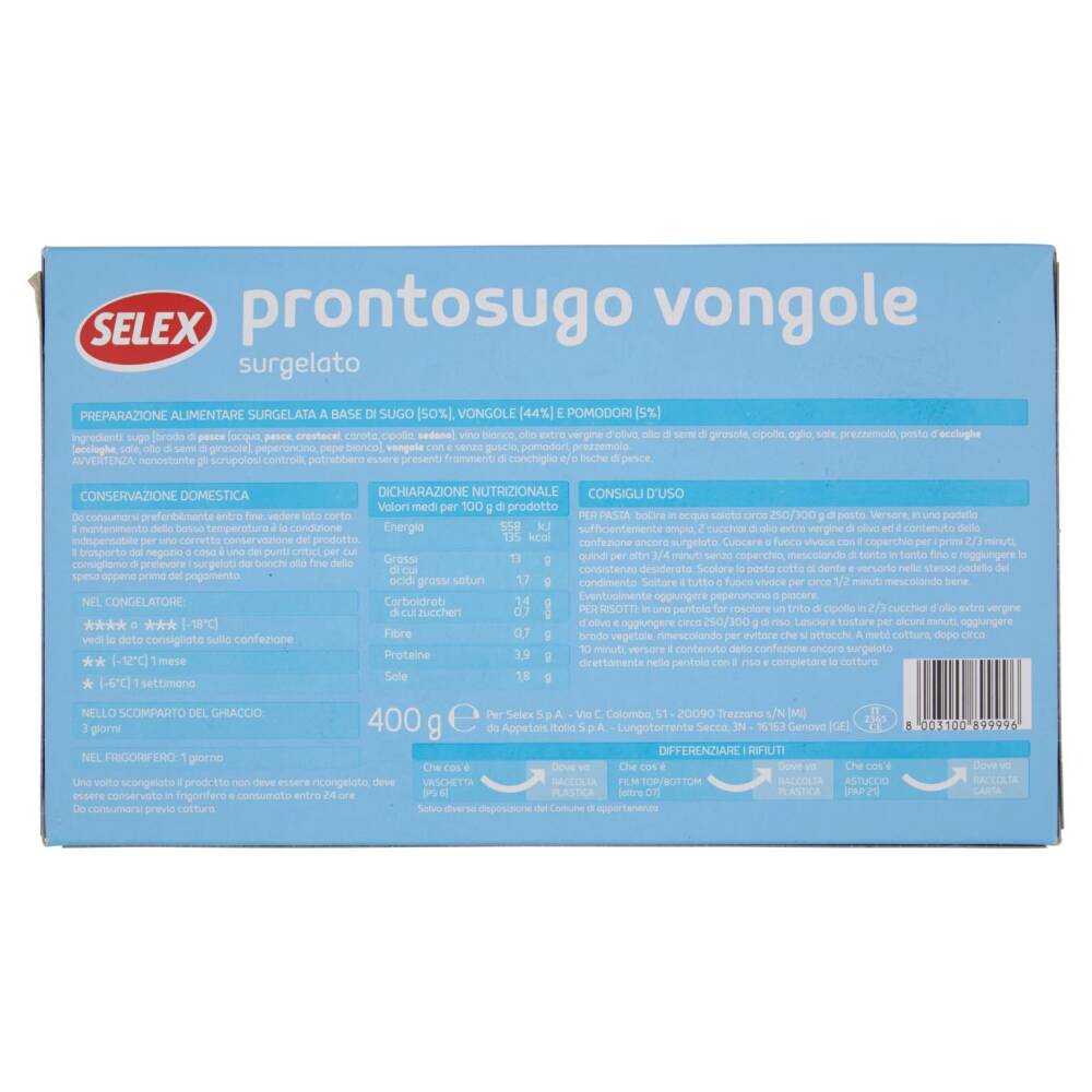 Sugo [brodo di pesce (acqua, pesce, crostacei, carota, cipolla, sedano), vino bianco, olio extra vergine d'oliva, olio di semi di girasole, cipolla, aglio, sale, prezzemolo, pasta d'acciughe (acciughe, sale, olio di semi di girasole), peperoncino, pepe bianco] Vongole cotte con e senza guscio Pomodori Prezzemolo Può contenere semi di sesamo e senape AVVERTENZA: nonostante gli scrupolosi controlli, potrebbero essere presenti frammenti di conchiglia e/o lische di pesce