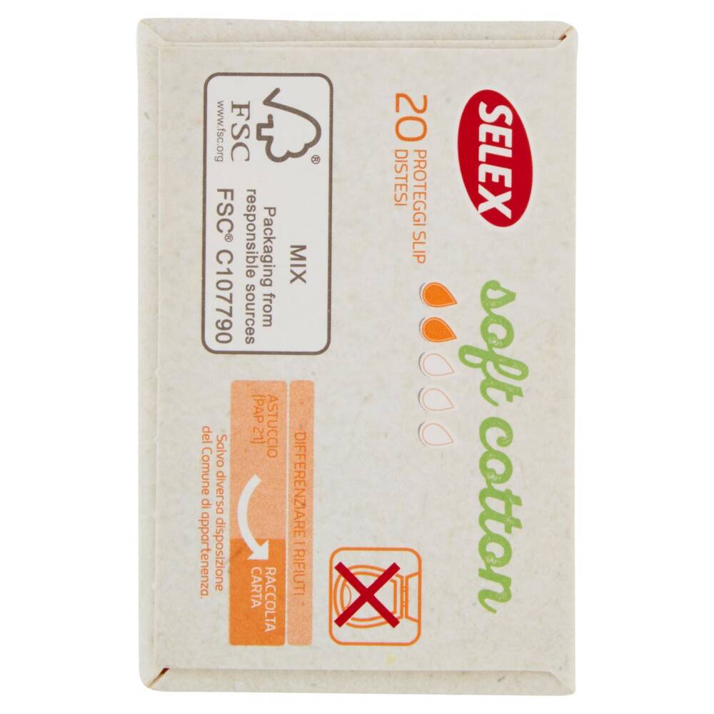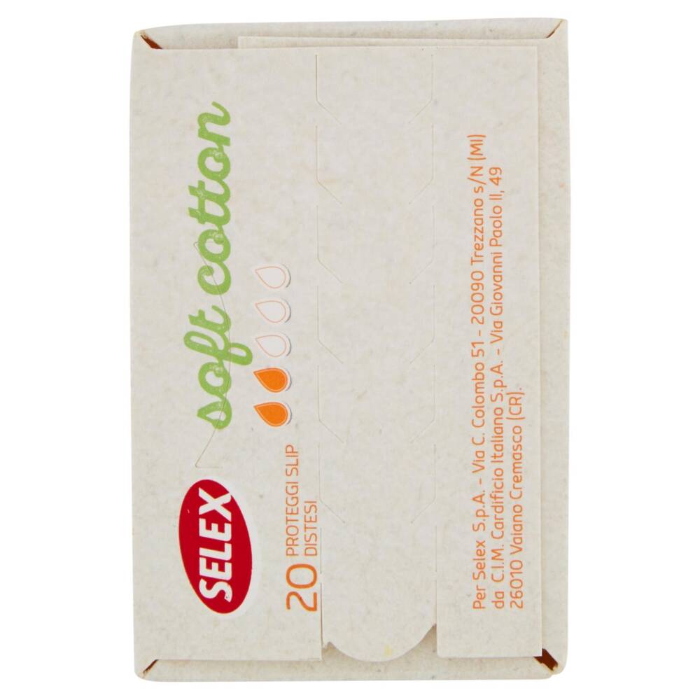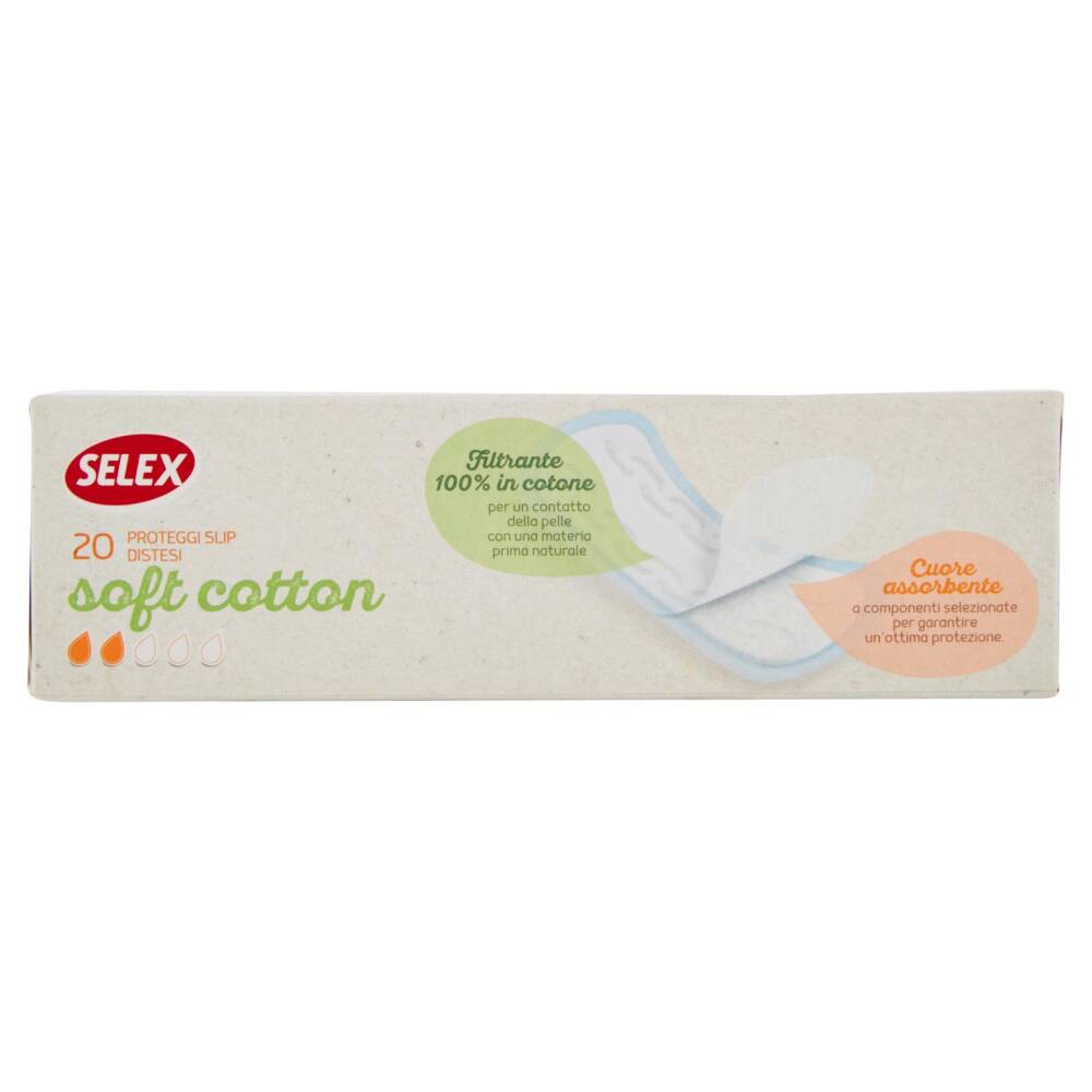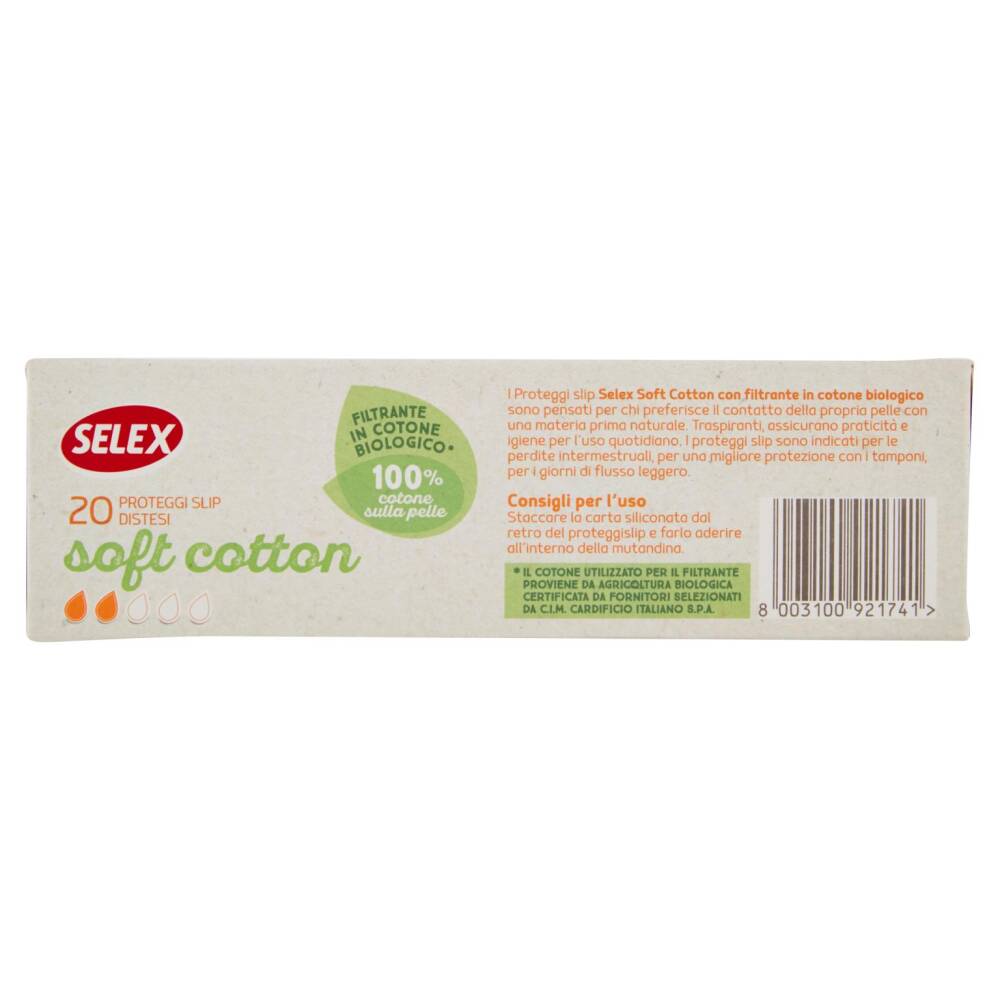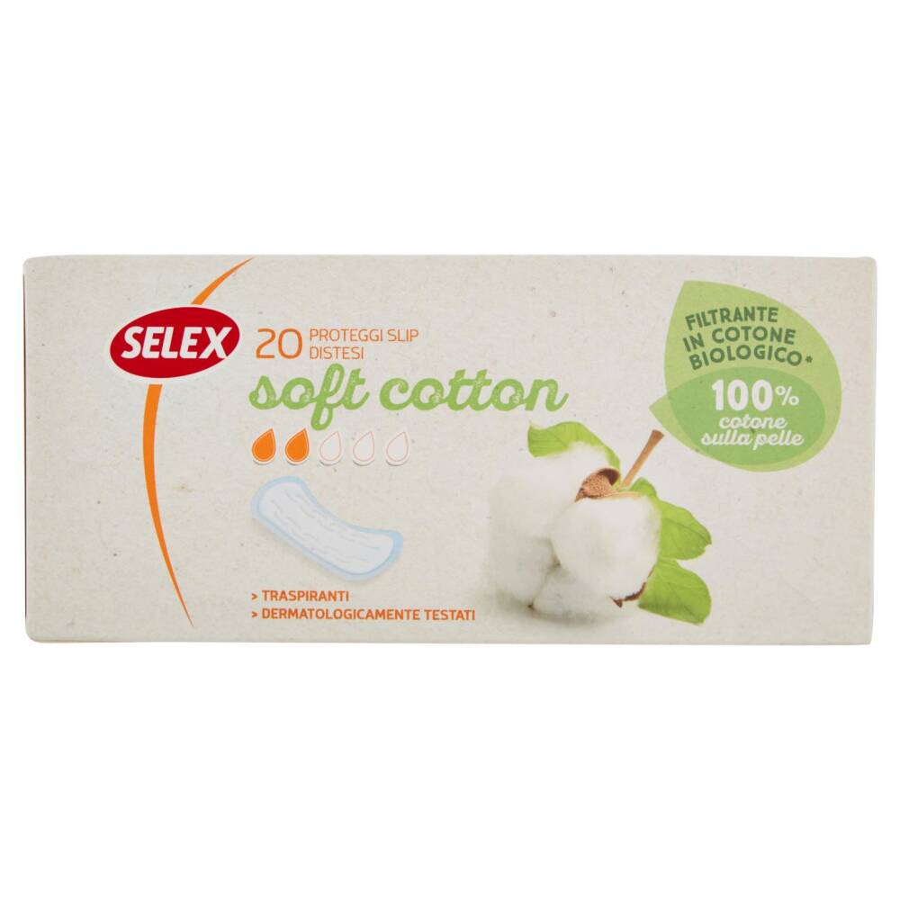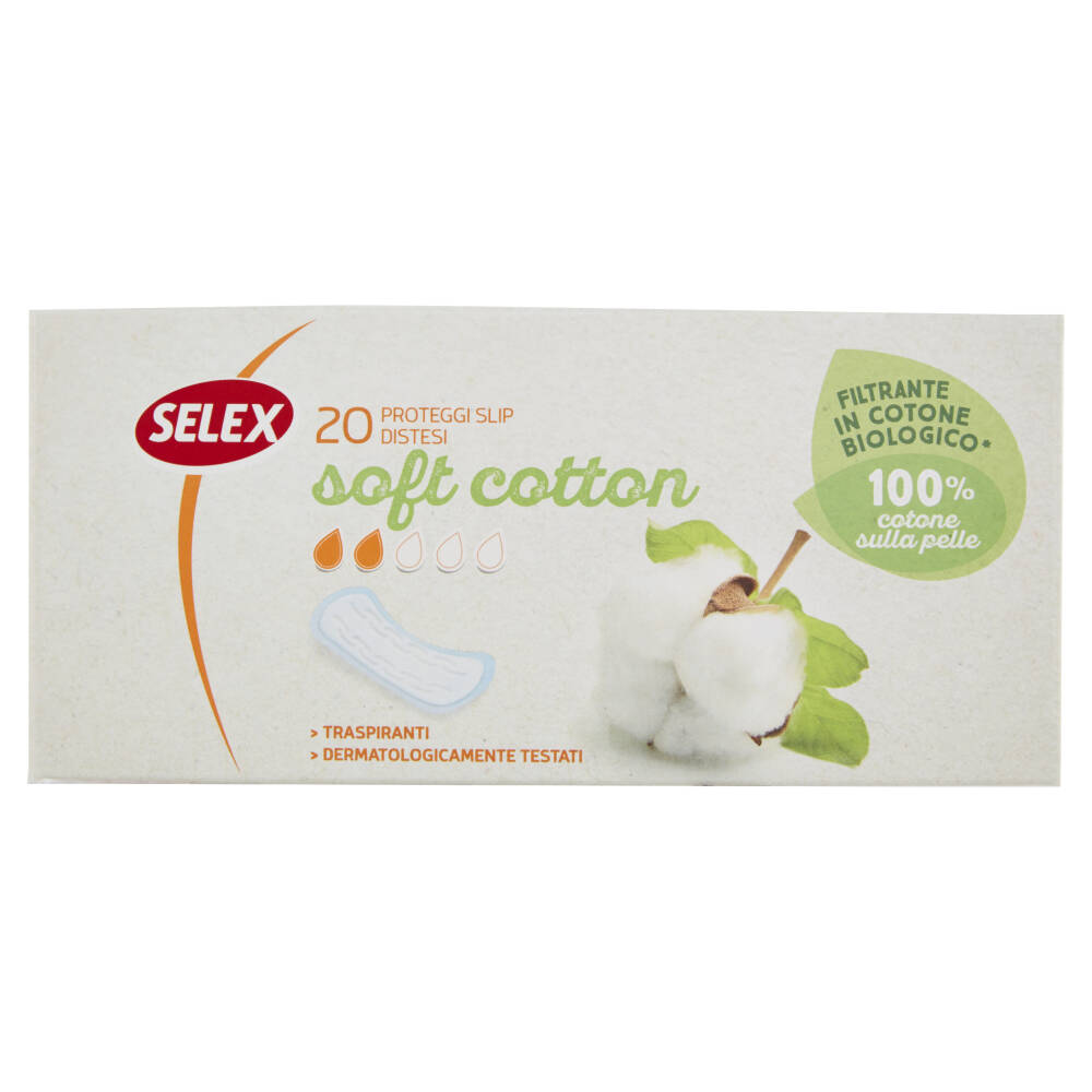 I Proteggi slip Selex Soft Cotton con filtrante in cotone biologico sono pensati per chi preferisce il contatto della propria pelle con una materia prima naturale. Traspiranti, assicurano praticità e igiene per l'uso quotidiano. I proteggi slip sono indicati per le perdite intermestruali, per una migliore protezione con i tamponi, per i giorni di flusso leggero. Filtrante 100% in cotone per un contatto della pelle con una materia prima naturale Cuore assorbente a componenti selezionate per garantire un'ottima protezione.