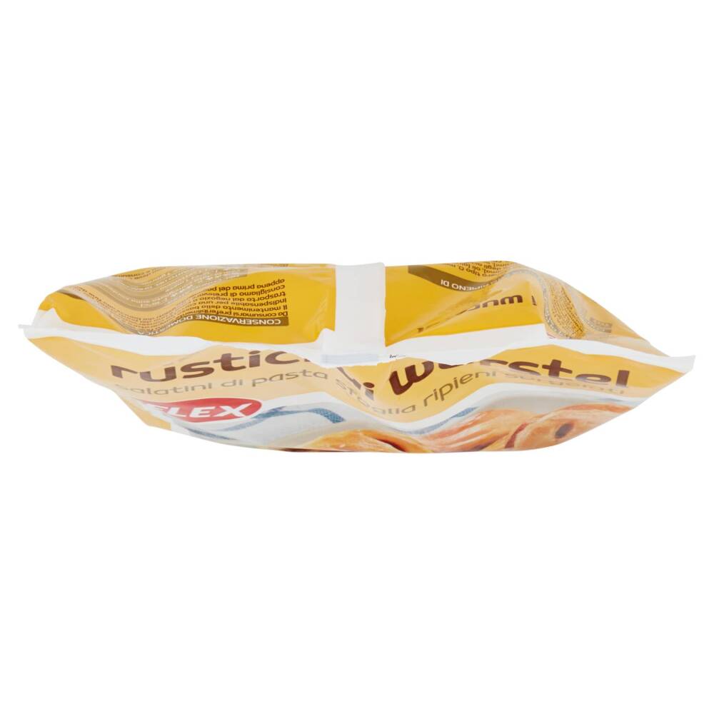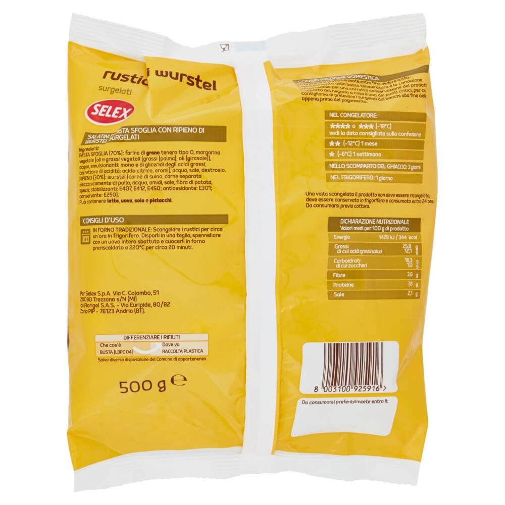 Ripieno (30%): wurstel (carne di suino, carne separata meccanicamente di pollo, acqua, amidi, sale, fibra di patata, spezie, stabilizzanti: E407, E412, E450; antiossidante: E301; conservante: E250)