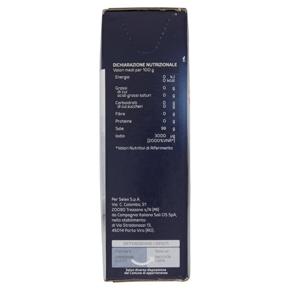 Sale ad uso alimentare estratto dall'acqua di mare e raffinato Iodato di potassio (0.0051%) pari a 3 mg di iodio per 100 g di prodotto Agenti antiagglomeranti: E504, E535 Origine: Mar Mediterraneo