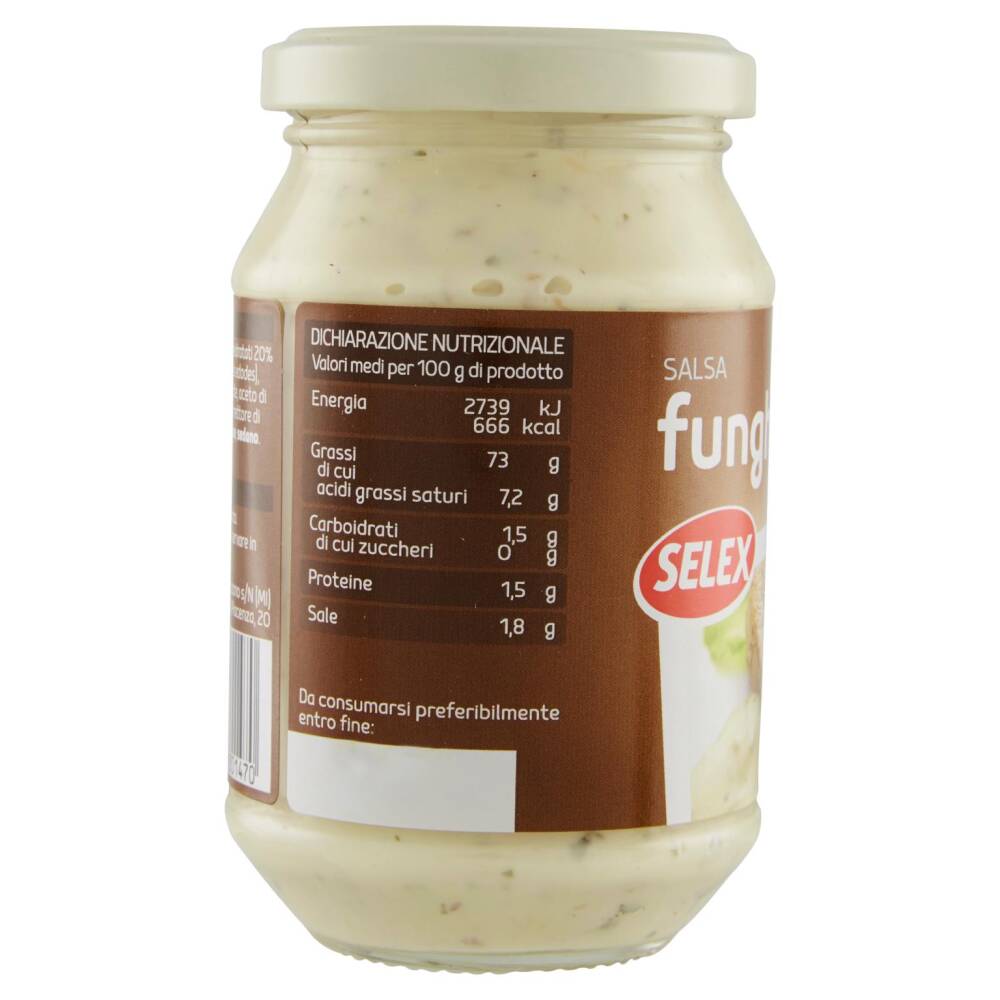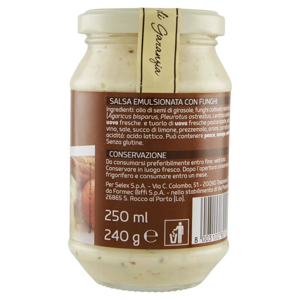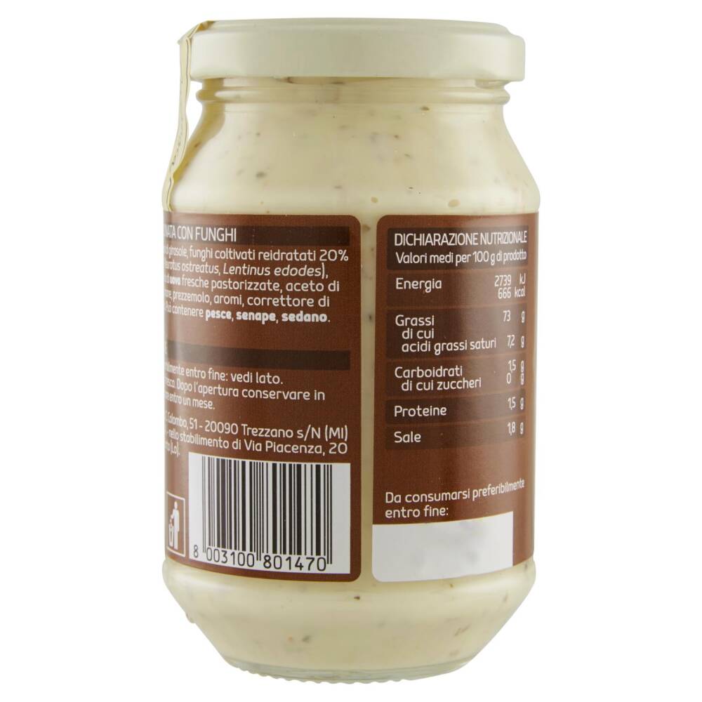 Olio di semi di girasole Funghi coltivati reidratati 20% (Agaricus bisporus, Pleurotus ostreatus, Lentinus edodes) Uova fresche e tuorlo di uova fresche pastorizzate Aceto di vino Sale Succo di limone Prezzemolo Aromi Correttore di acidità: acido lattico Può contenere pesce, senape, sedano Senza glutine