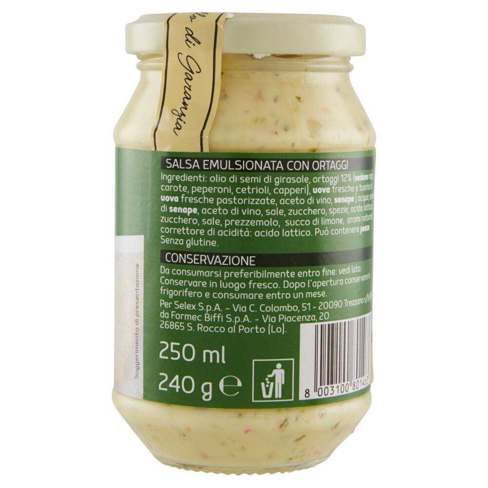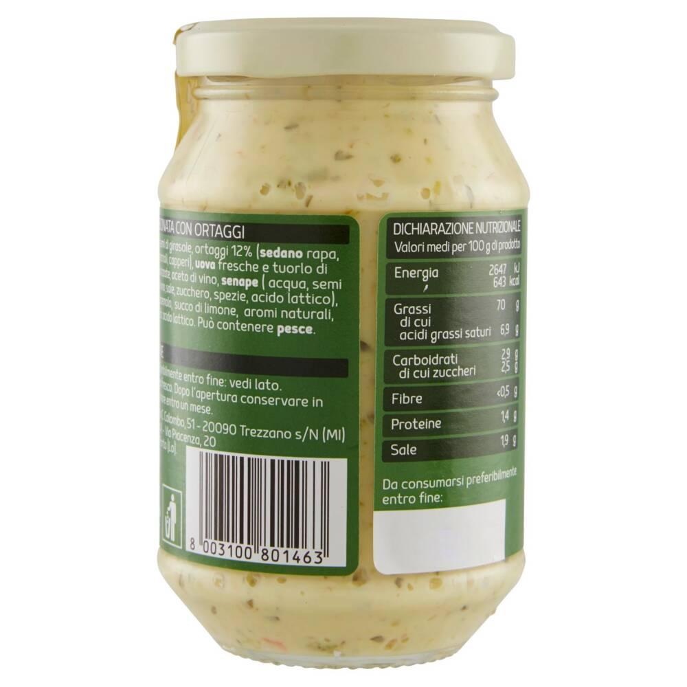 Olio di semi di girasole Ortaggi 12% (sedano rapa, carote, peperoni, cetrioli, capperi) Uova fresche e tuorlo di uova fresche pastorizzate Aceto di vino Senape (acqua, semi di senape, aceto di vino, sale, zucchero, spezie, acido lattico) Zucchero Sale Prezzemolo Succo di limone Aromi naturali Correttore di acidità: acido lattico Può contenere pesce Senza glutine