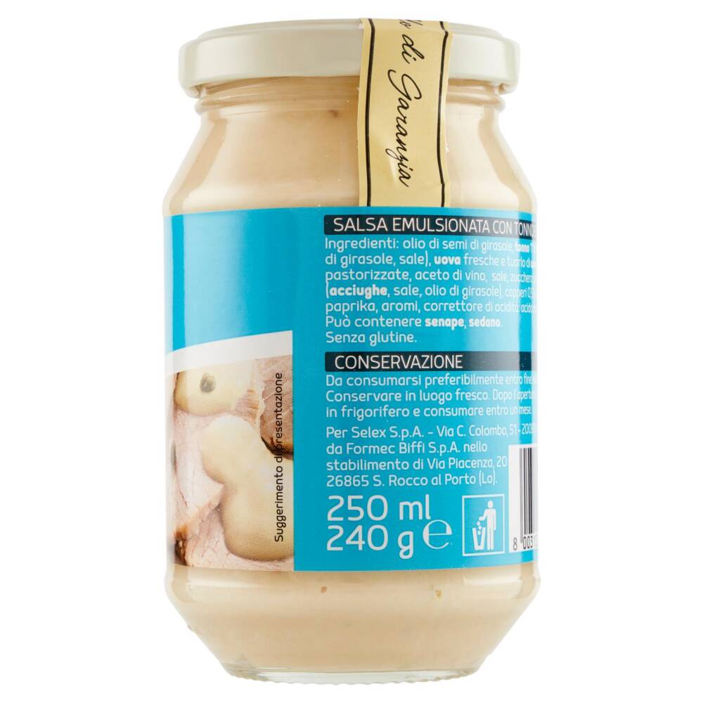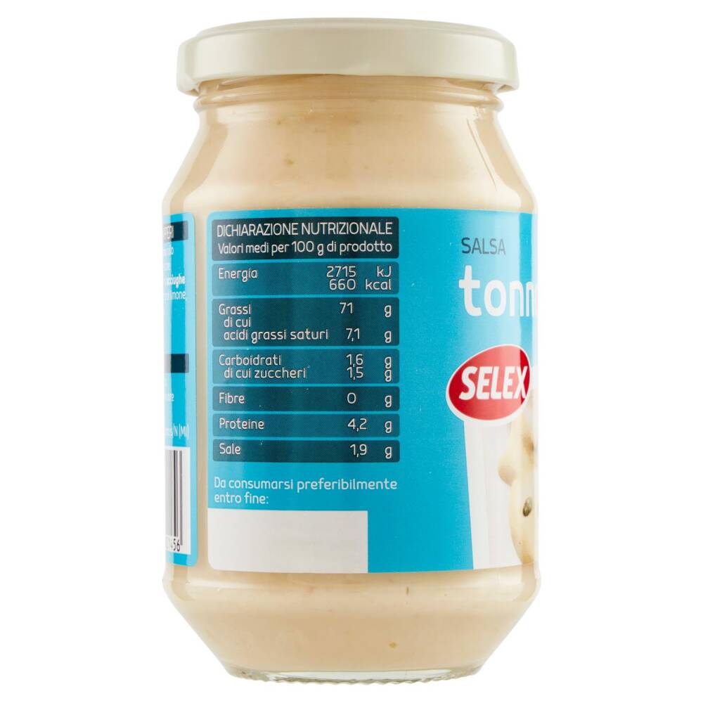 Olio di semi di girasole Tonno 11% (tonno, olio di girasole, sale) Uova fresche e tuorlo di uova fresche pastorizzate Aceto di vino Sale Zucchero Pasta di acciughe (acciughe, sale, olio di girasole) Capperi 0,5% Succo di limone Paprika Aromi Correttore di acidità: acido lattico Può contenere senape, sedano Senza glutine