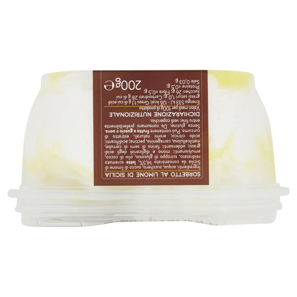 Acqua Zucchero Succo di limone di Sicilia da concentrato 14,5% Latte scremato reidratato Sciroppo di glucosio Olio di cocco Emulsionanti: mono e digliceridi degli acidi grassi Addensanti: farina di semi di carrube, metilcellulosa, carragenina, pectina Acidificanti: acido citrico Aromi naturali Estratto di curcuma Può contenere frutta a guscio e uova Senza glutine