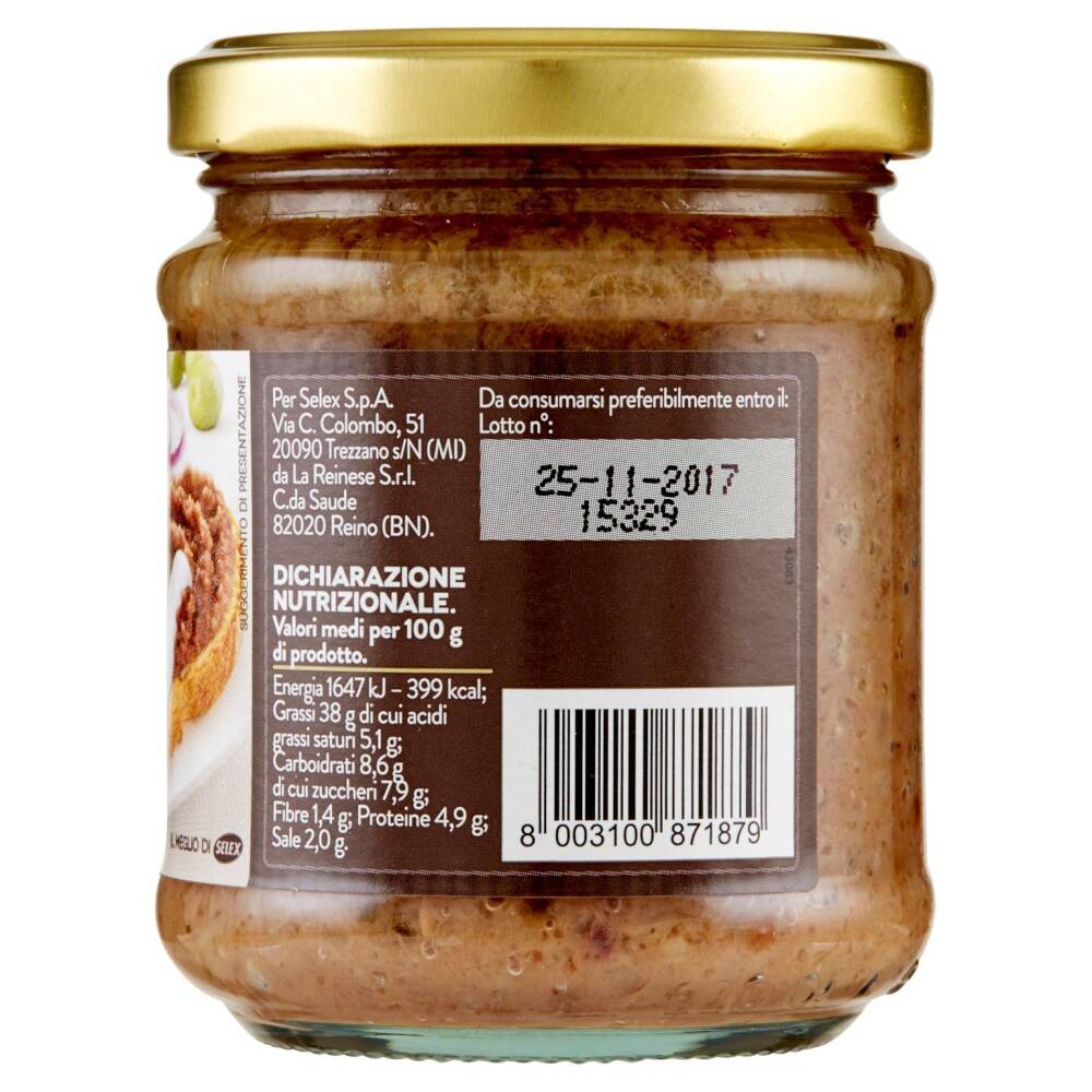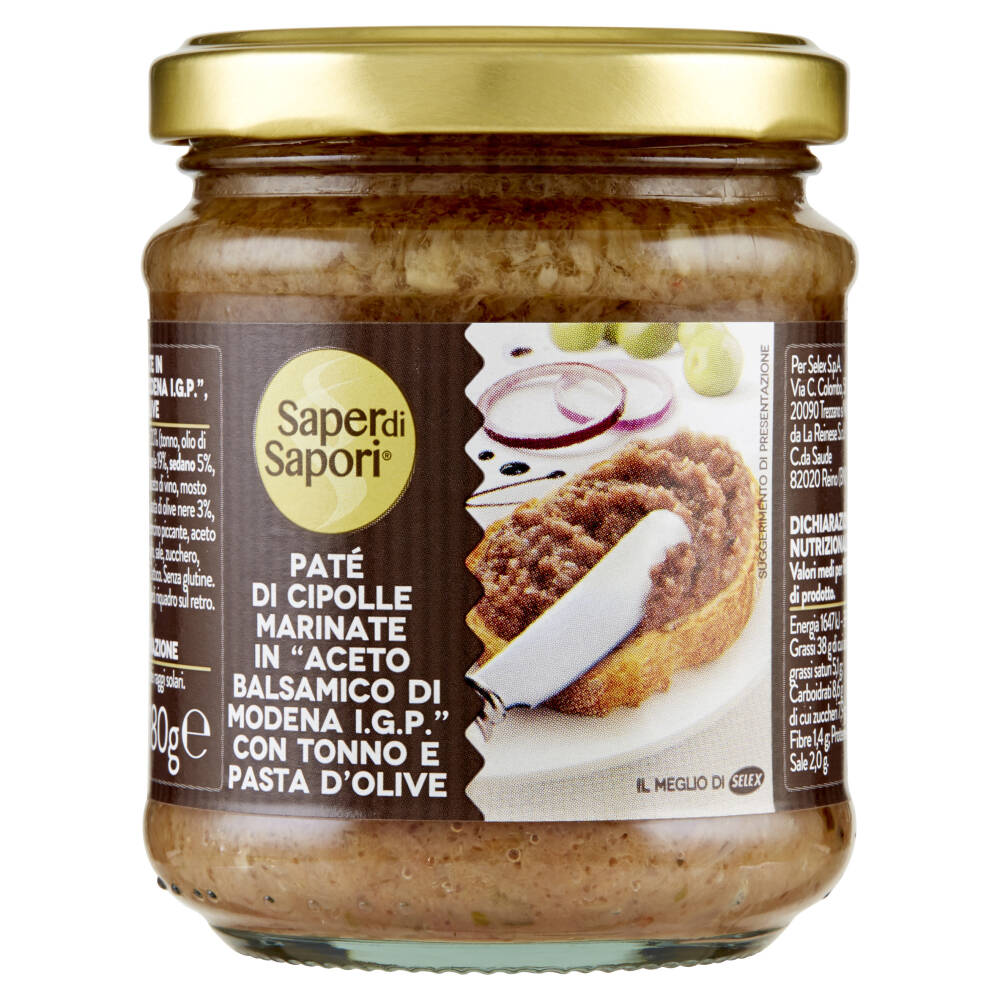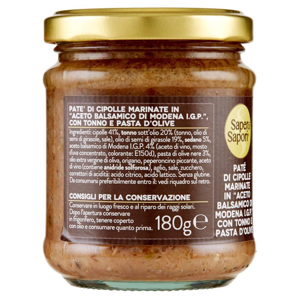 Cipolle 41% Tonno sott'olio 20% (tonno, olio di semi di girasole, sale) Olio di semi di girasole 19% Sedano 5% Aceto balsamico di Modena I.G.P. 4% (aceto di vino, mosto d'uva concentrato, colorante: E150d) Pasta di olive nere 3% Olio extra vergine di oliva Origano Peperoncino piccante Aceto di vino (contiene anidride solforosa) Aglio Sale Zucchero Correttori di acidità: acido citrico, acido lattico Senza glutine