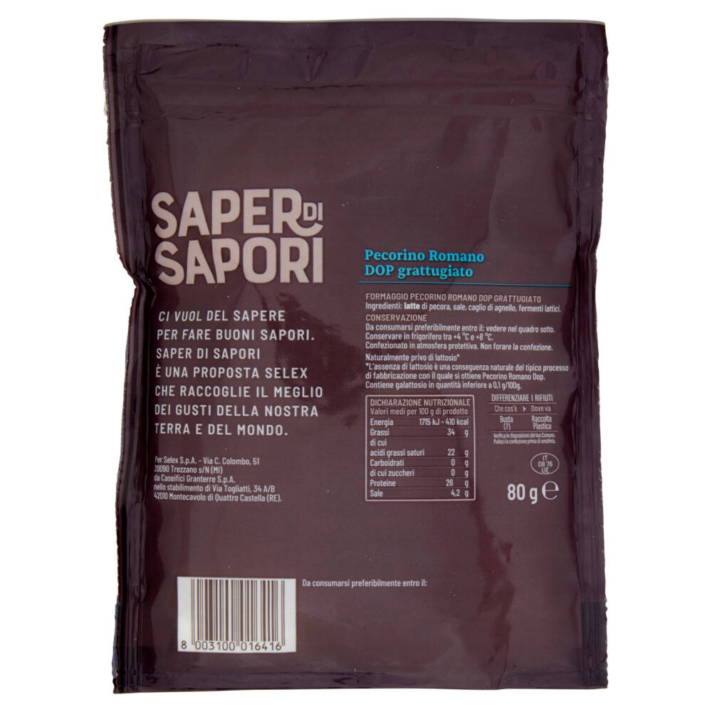Naturalmente privo di lattosio* *L'assenza di lattosio è una conseguenza naturale del tipico processo di fabbricazione con il quale si ottiene Pecorino Romano DOP. Contiene galattosio in quantità inferiore a 0,1 g/100g