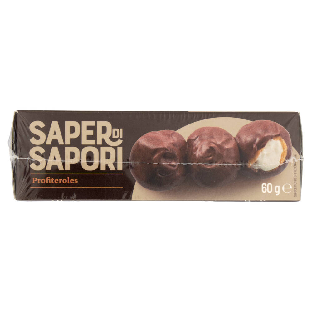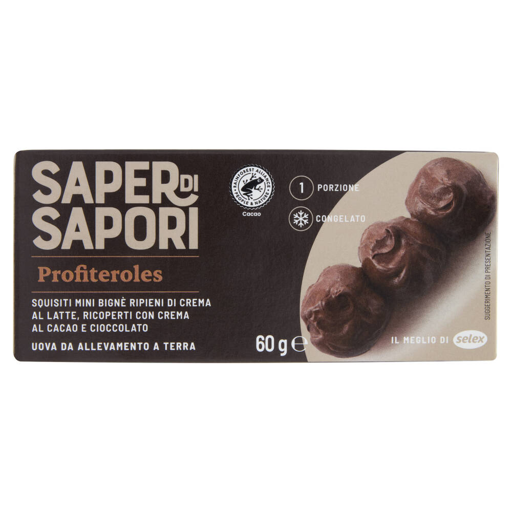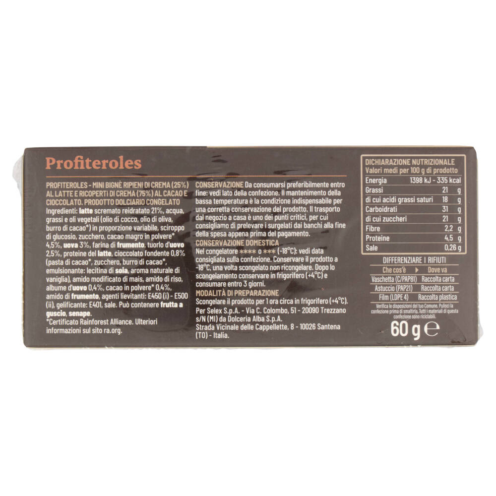 Profiteroles - Mini bignè ripieni di crema (25%) al latte e ricoperti di crema (75%) al cacao e cioccolato. Prodotto dolciario congelato