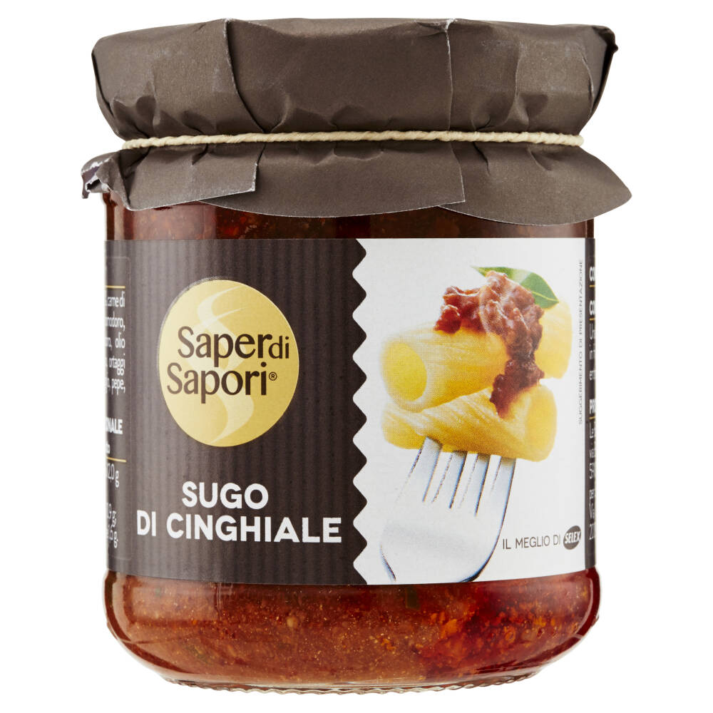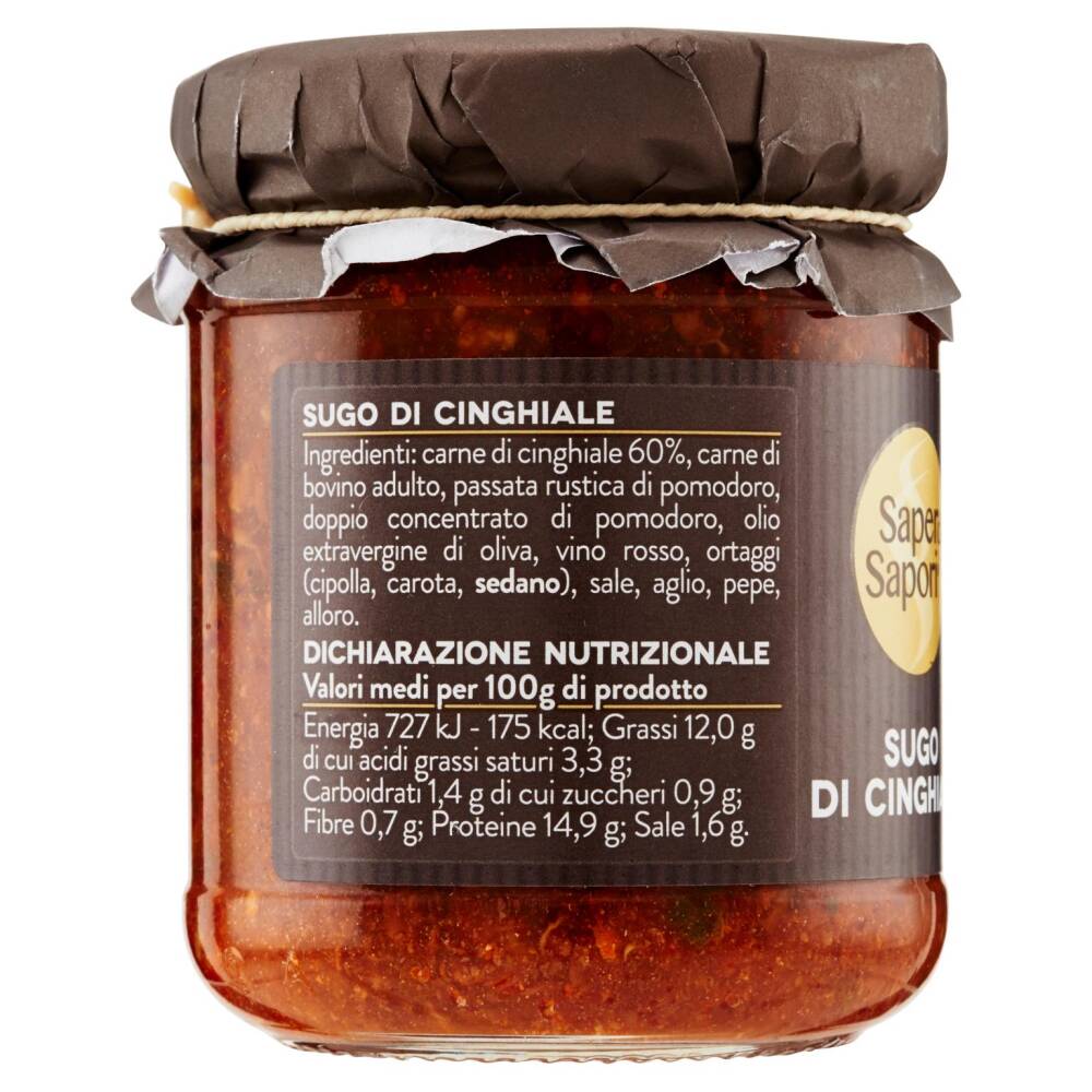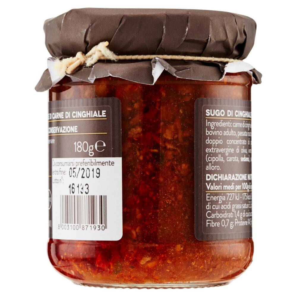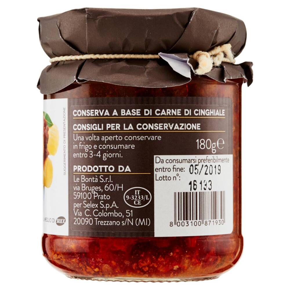 Carne di cinghiale 60% Carne di bovino adulto Passata rustica di pomodoro Doppio concentrato di pomodoro Olio extravergine di oliva Vino rosso Ortaggi (cipolla, carota, sedano) Sale Aglio Pepe Alloro