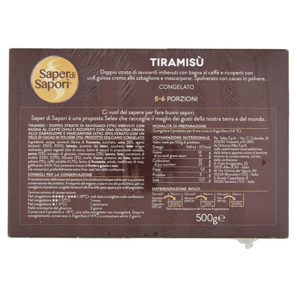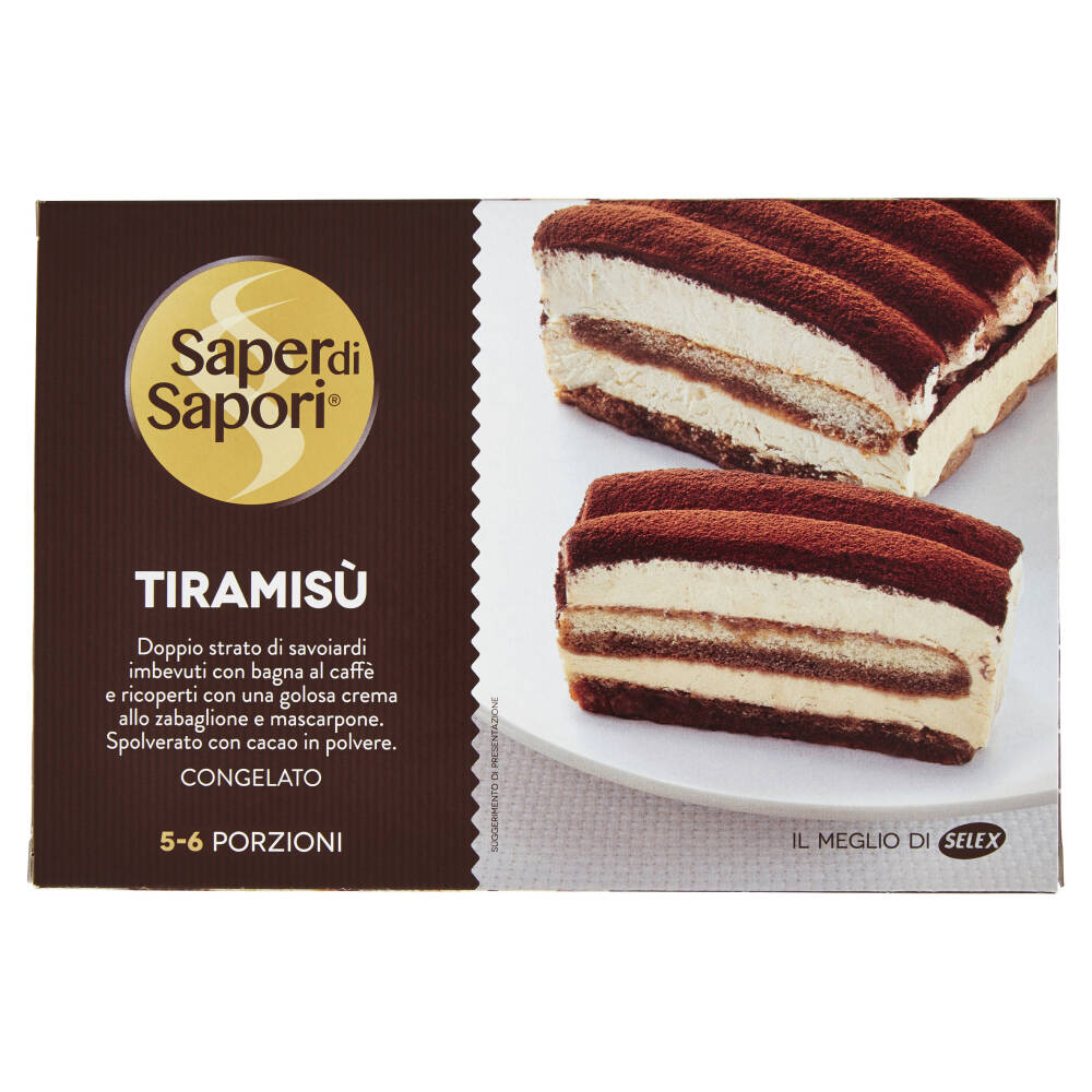 Tiramisù - Doppio strato di savoiardi (17%) imbevuti con bagna al caffè (34%) e ricoperti con una golosa crema allo zabaglione e mascarpone (47%). Spolverato con un velo di cacao in polvere (1%). Prodotto dolciario congelato