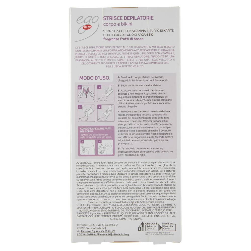 Le strisce depilatorie sono pronte all'uso. Realizzate in morbido tessuto non tessuto, hanno una formulazione nuova ed efficace per l'eliminazione pratica e veloce dei peli superflui, anche di quelli più corti. Con vitamina E, burro di karitè e olio di cocco, le strisce depilatorie, arricchite da una fragranza ai frutti di bosco, sono perfette per una pelle vellutata e delicatamente profumata. La formulazione è priva di parabeni, BHT, pelle liscia, effetto velluto.
