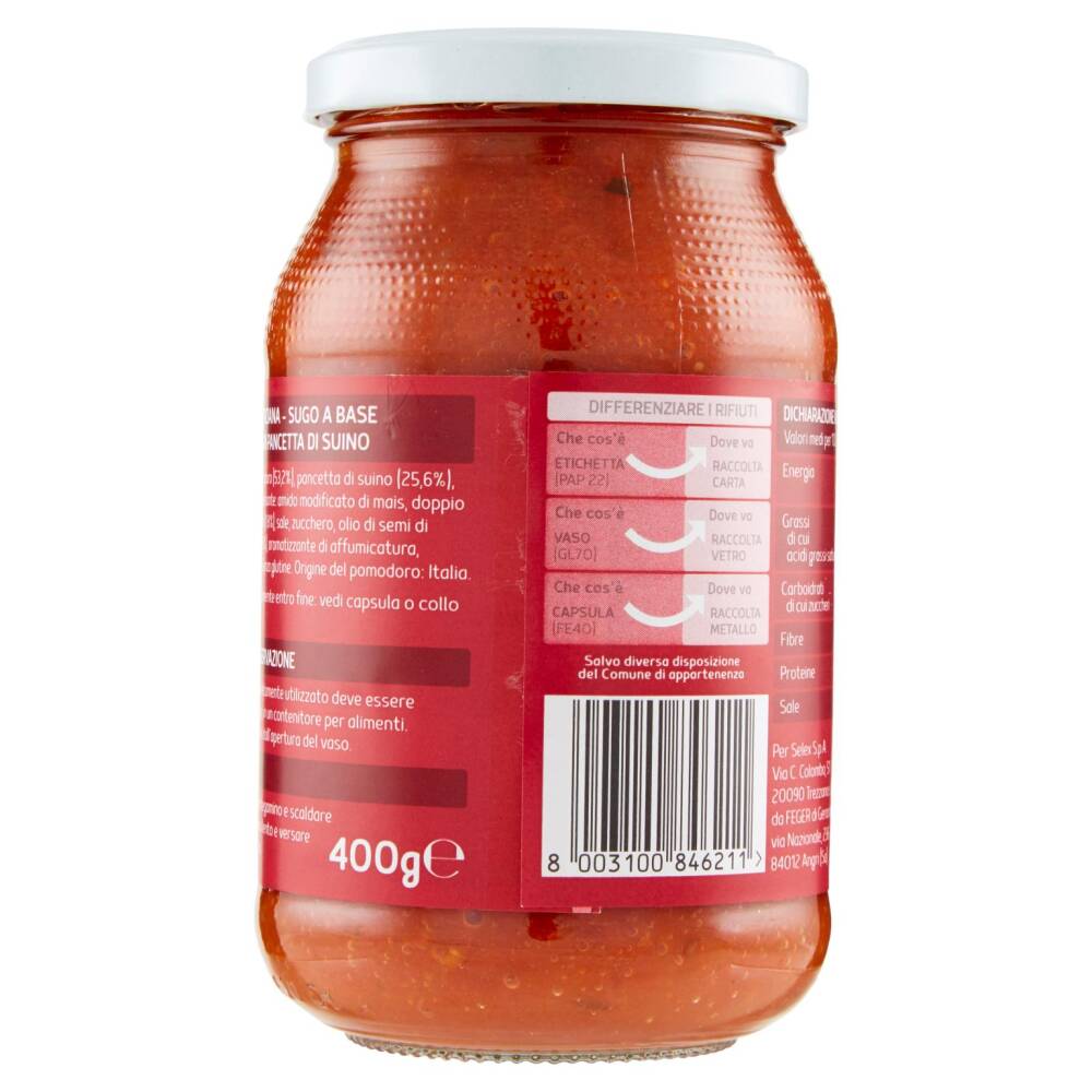 Polpa di pomodoro (53,2%) Pancetta di suino (25,6%) Cipolla (7,3%) Acqua Addensante: amido modificato di mais Doppio concentrato di pomodoro (1,8%) Sale Zucchero Olio di semi di girasole Prezzemolo (0,25%) Aromatizzante di affumicatura Peperoncino Pepe nero Senza glutine