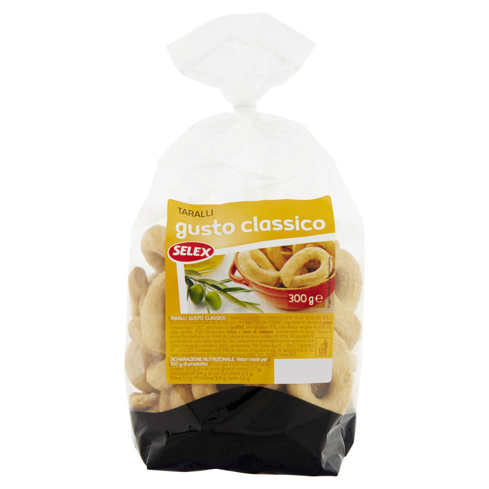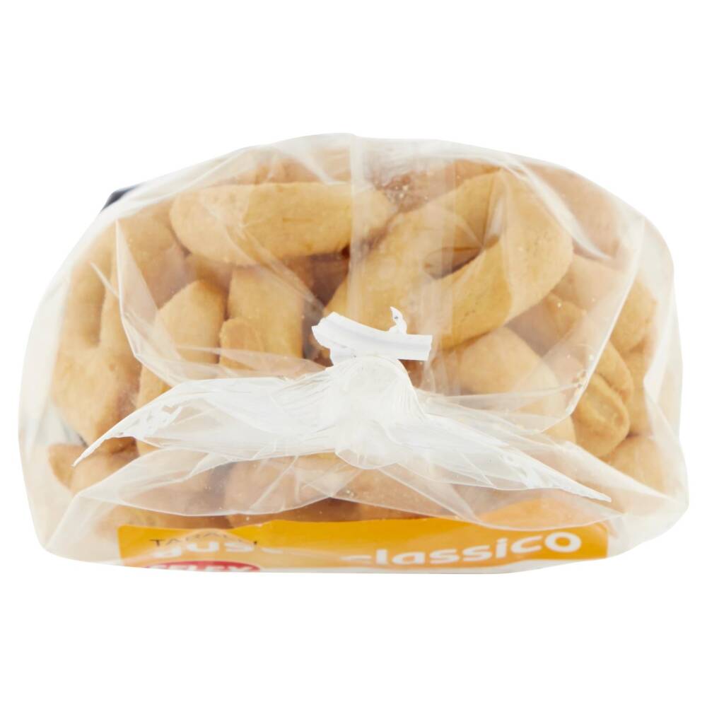 Taralli gusto classico con olio di oliva 15% e olio extravergine di oliva 5%. Prodotto da forno
